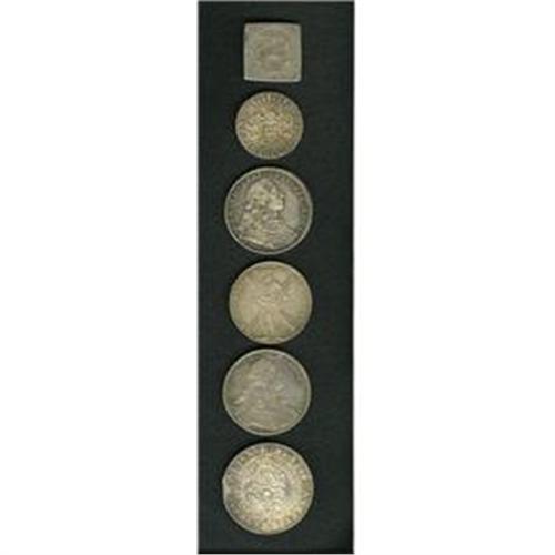 <B>Selection of Early Silver Types, </B></I>Bavaria Taler 1641 KM58.3, Dav-6081, VF-XF, planchet clip, light scratches in the reverse fields, Bavaria Taler 1754 KM224, Dav-1948, toned VF, Bavaria Taler 1759 KM224, toned VF, Brunswick-Luneburg Taler 1765-IWS KM343, Dav-2104, nicely toned VF-XF, attractive, Hamburg 32 Schilling 1809-HSK KM241, toned XF+ and Ulm Klippe Gulden 1704 KM34, choice VF+. <B>Sold as is, no return lot.</B></I><BR><BR><b>Shipping:</b> Coins & Currency (<a target="_blank" href="http://www.heritageauctions.com/common/shipping.php">view shipping information</a>)
