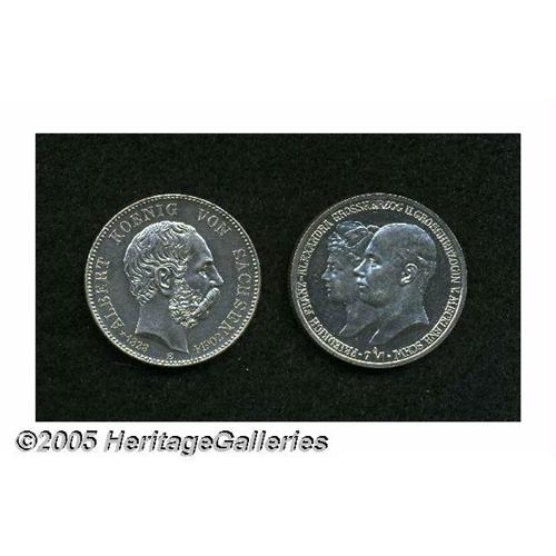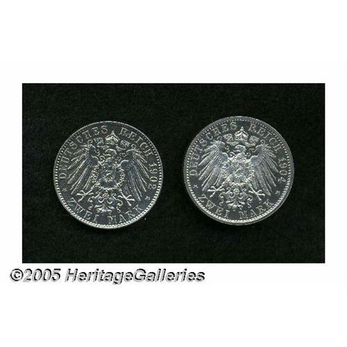 <B>Two Mark pair as follows:</B></I> Mecklenburg-Schwerin 2 Mark 1904, Wedding Commemorative, KM333, Proof with a few light hairlines; and a Saxony 2 Mark 1902E, Death of Albert, KM1255, cleaned AU/UNC. <B>A sold as is, no return lot.</B></I>
