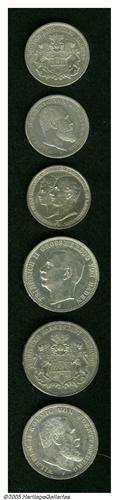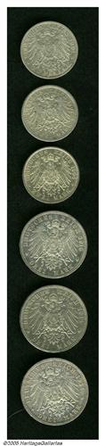 <B>Two and Three Mark lot including:</B></I> Hamburg 2 Mark 1901-J, KM294, VF-XF; Mecklenburg-Schwerin 2 Mark 1904-A, KM333, cleaned XF; Wurttemberg 2 Mark 1907-F, KM631, VF-XF; Baden 3 Mark 1915-G, KM280, XF; Hamburg 3 Mark 1914-J, KM296, XF; and a Wurttemberg 3 Mark 1914-F, KM635, XF. <B>A sold as is, no return lot.</B></I> From the Dr. Kurt Peters Collection.
