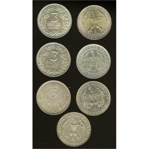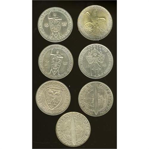 <B>Weimar Republic 3-Marks selection:</B></I> (2) Rhineland 1925-A, 2 pieces sharp AU. Lubeck 1926-A, AU. Meissen 1000th Anniversary 1929-E, About XF. Waldeck-Prussia Union 1929-A, Choice Unc. and beautiful. (2) Zeppelin 1930-D and 1930-J, each nice AU. A really nice group.<BR><BR><b>Shipping:</b> Coins & Currency (<a target="_blank" href="http://www.heritageauctions.com/common/shipping.php">view shipping information</a>)