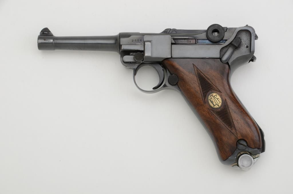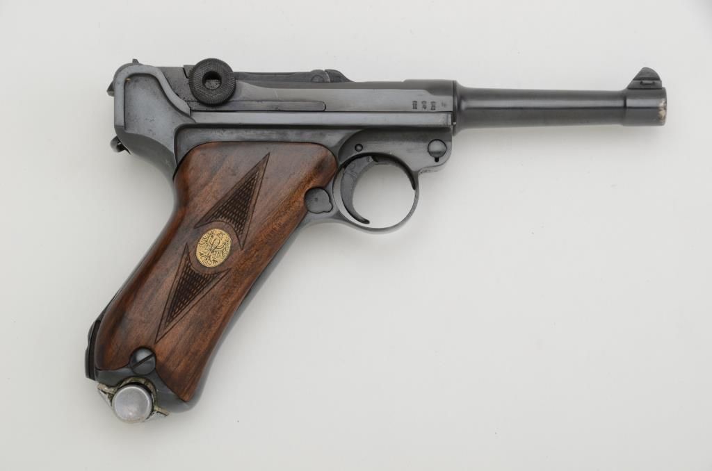German Luger semi-auto pistol by Erfurt, 9mm cal., 4” barrel, re-finished, custom checkered medallion wood grips, #9684 a. This gun is in overall good condition as re-blued, matching visible numbers exceptmagazine, good bore, action and grips. From an old estate. Est.: $400-$800.