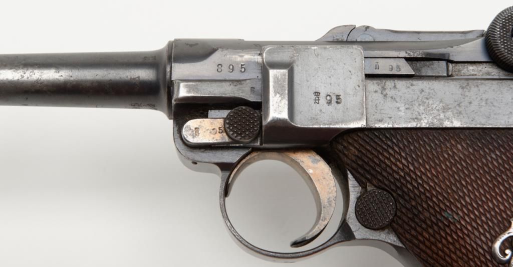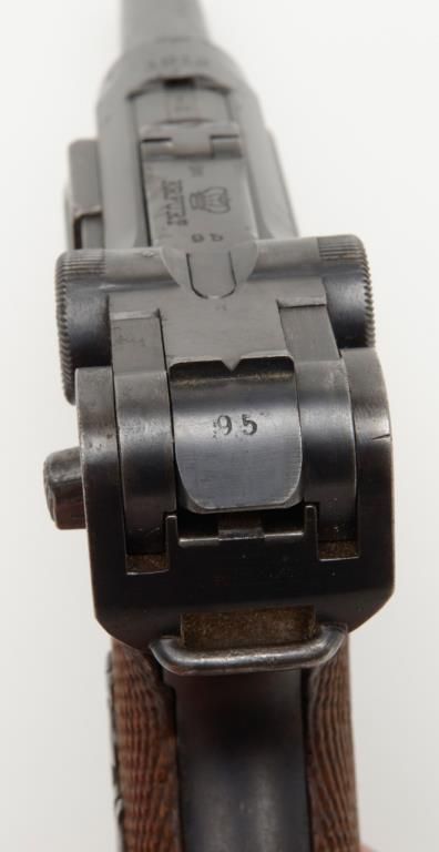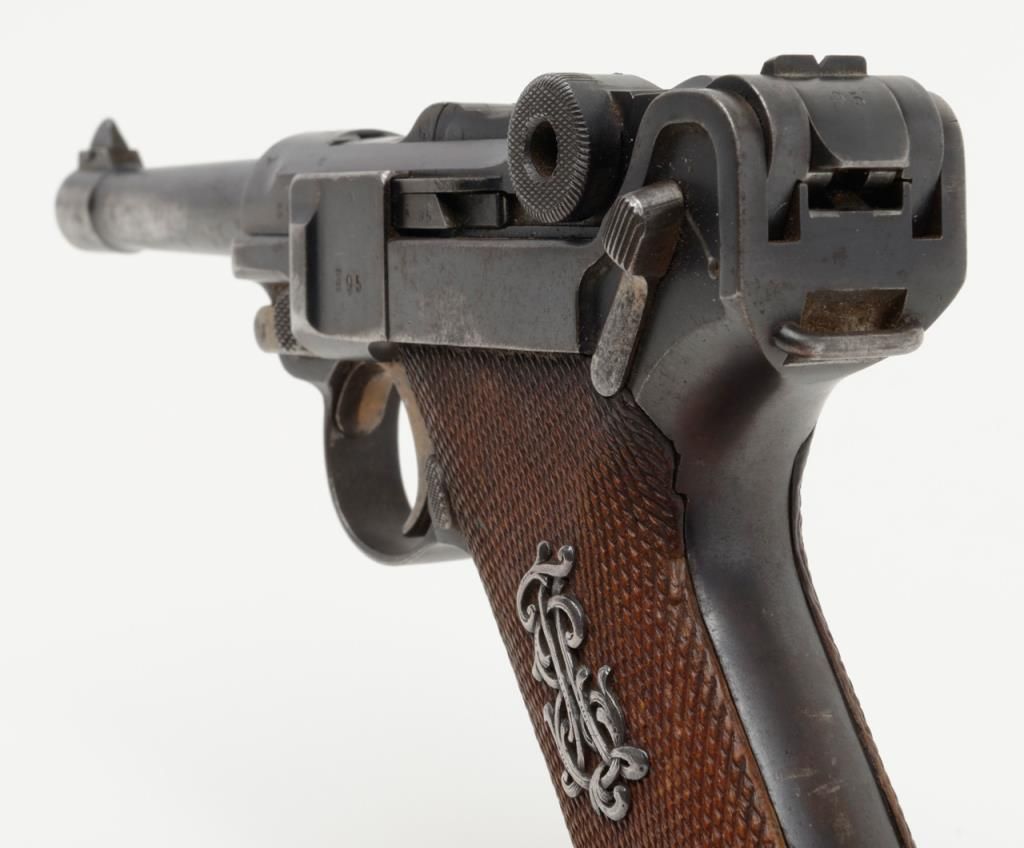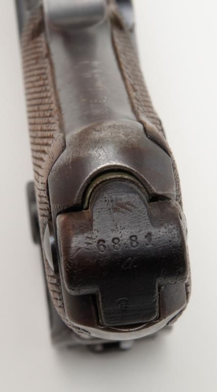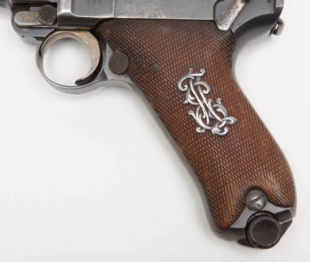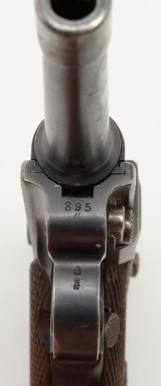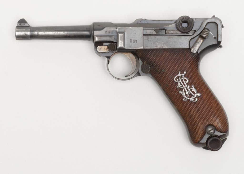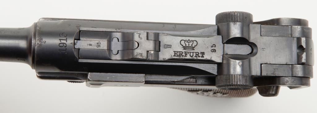 German Luger semi-auto pistol by Erfurt Royal Arsenal dated 1913 on top of frame, post-war sear safety police rework, 9mm cal., 4” barrel, blue finish, checkered wood grips with added ornate silver initials applied to left grip, #895a inoverall very good condition showing considerable blue finish, honest wear, scattered spots of erosion and pinprick pitting, some straw finish still visible on some small parts, front grip strap marked “2.J.M.G. 76.”; all matching visiblenumbers except the wood base magazine which is numbered 6881a; fair to good bore, good markings and grips; from an old California bay area estate. (C&R). Est.: $600-$1,200.