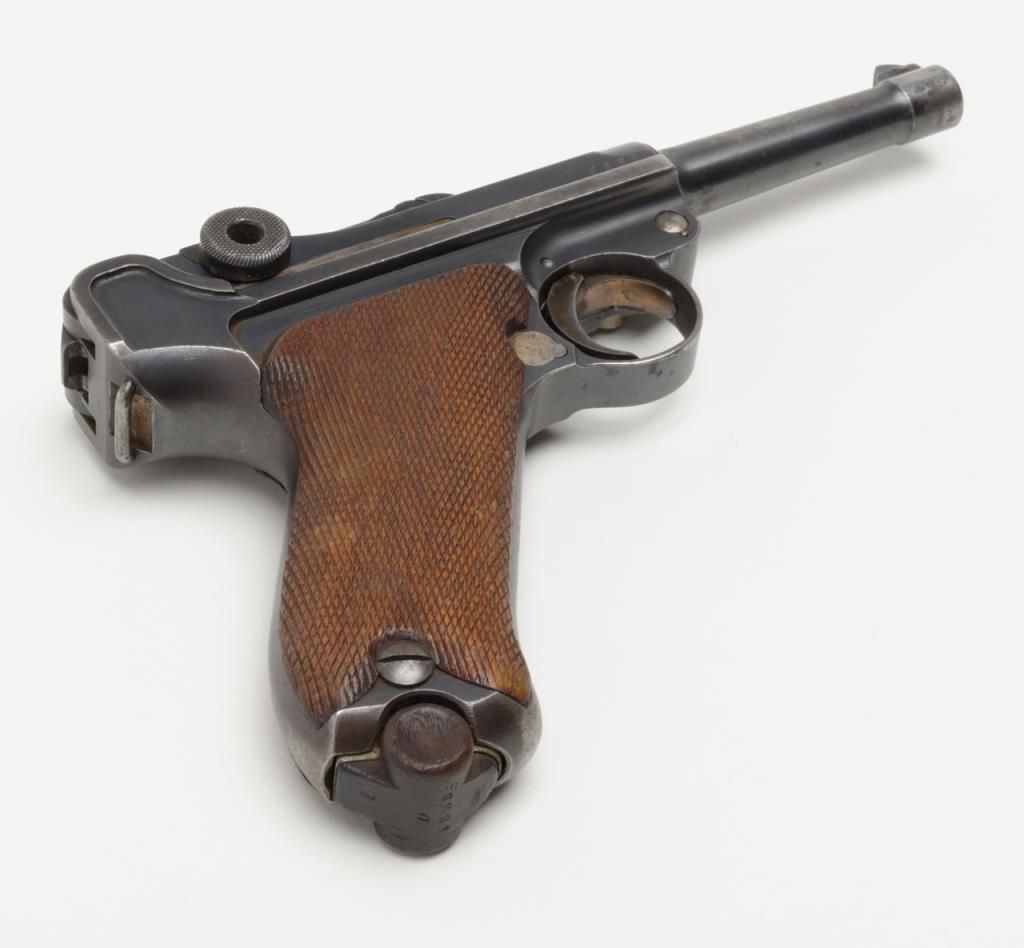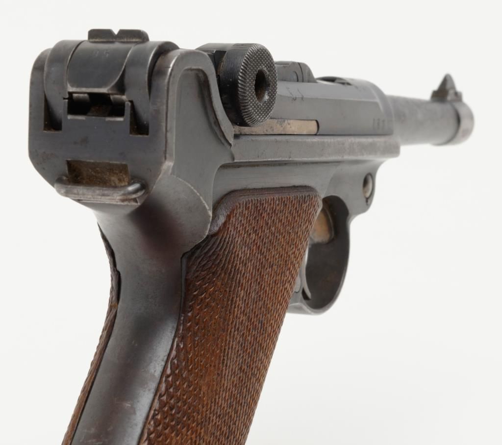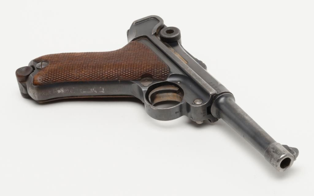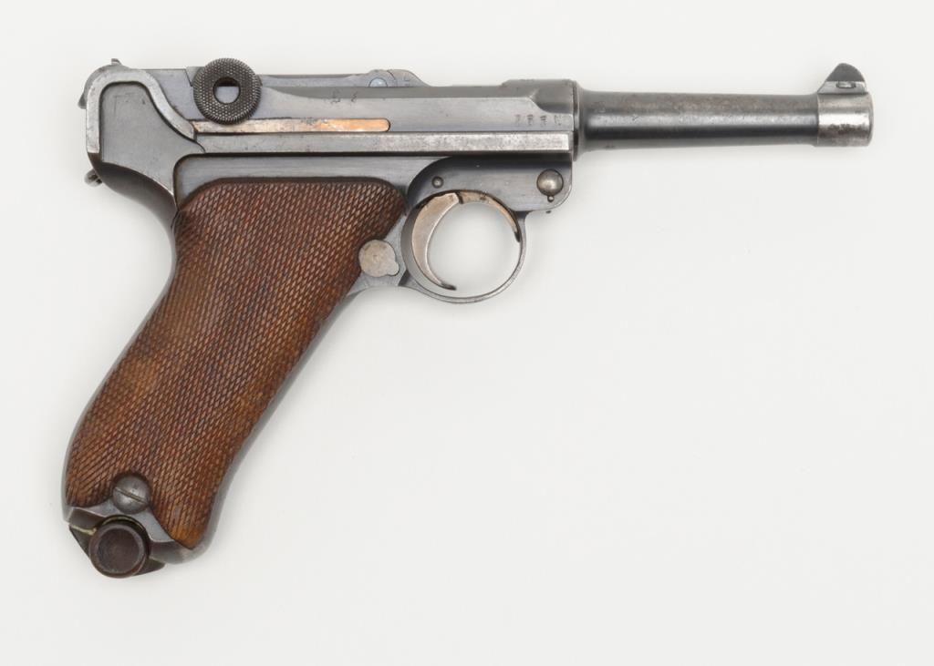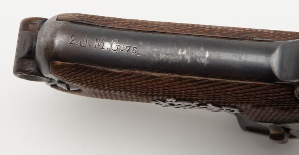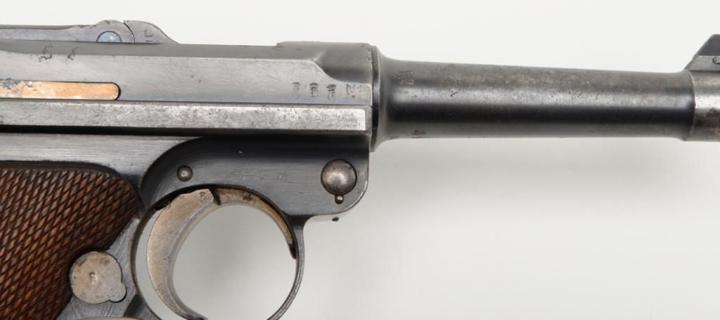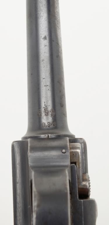 German Luger semi-auto pistol by Erfurt Royal Arsenal dated 1913 on top of frame, post-war sear safety police rework, 9mm cal., 4” barrel, blue finish, checkered wood grips with added ornate silver initials applied to left grip, #895a inoverall very good condition showing considerable blue finish, honest wear, scattered spots of erosion and pinprick pitting, some straw finish still visible on some small parts, front grip strap marked “2.J.M.G. 76.”; all matching visiblenumbers except the wood base magazine which is numbered 6881a; fair to good bore, good markings and grips; from an old California bay area estate. (C&R). Est.: $600-$1,200.