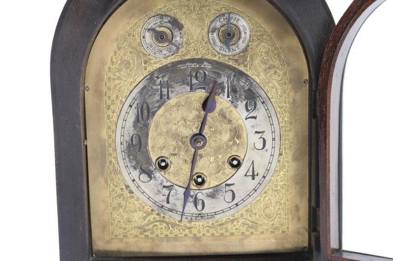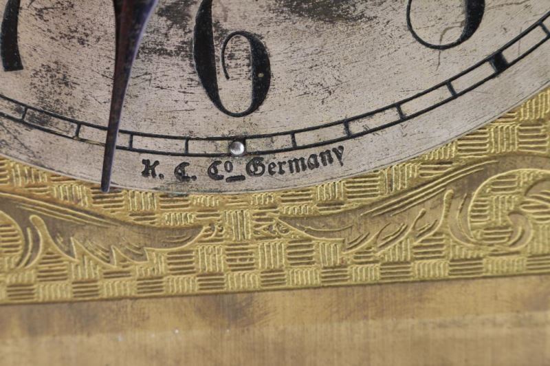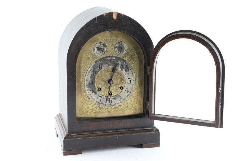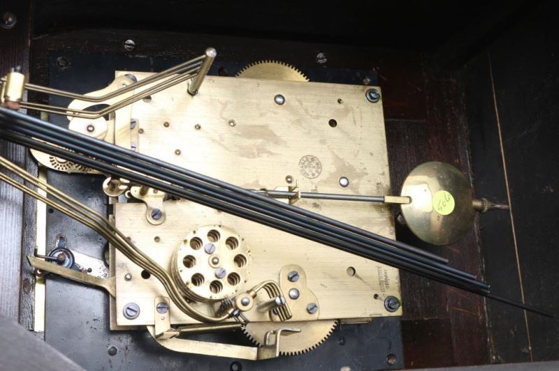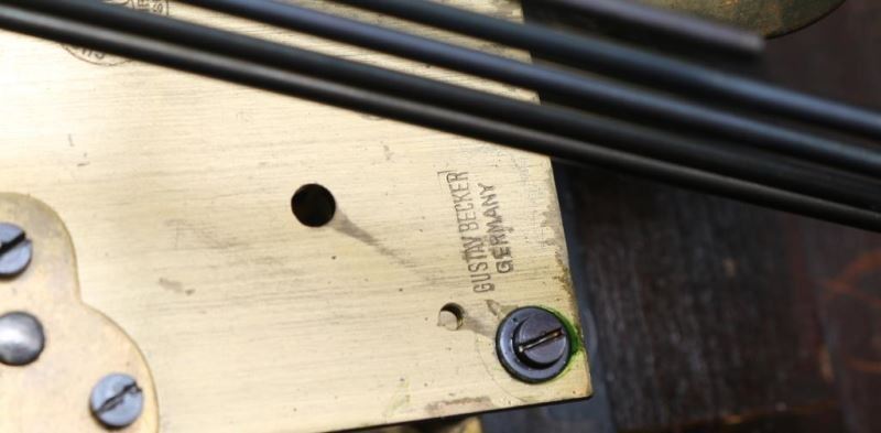 made by Becker , wood case with engraved brass front with beveled glass front, unknown if working.