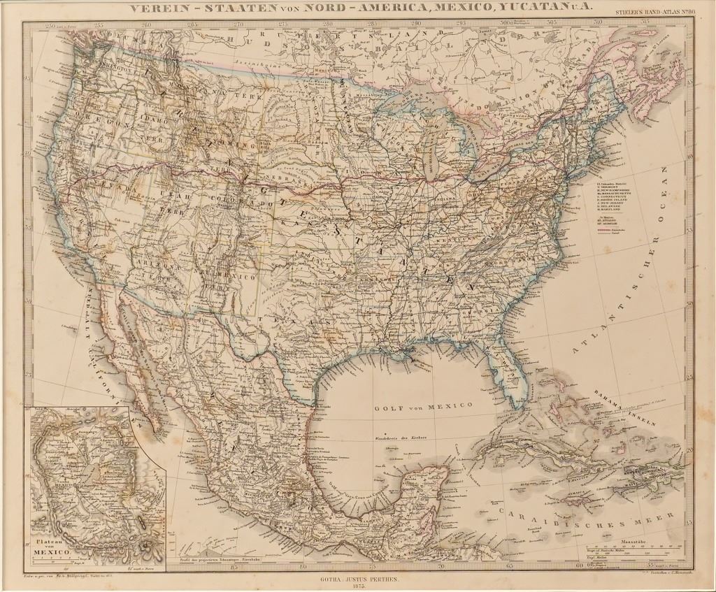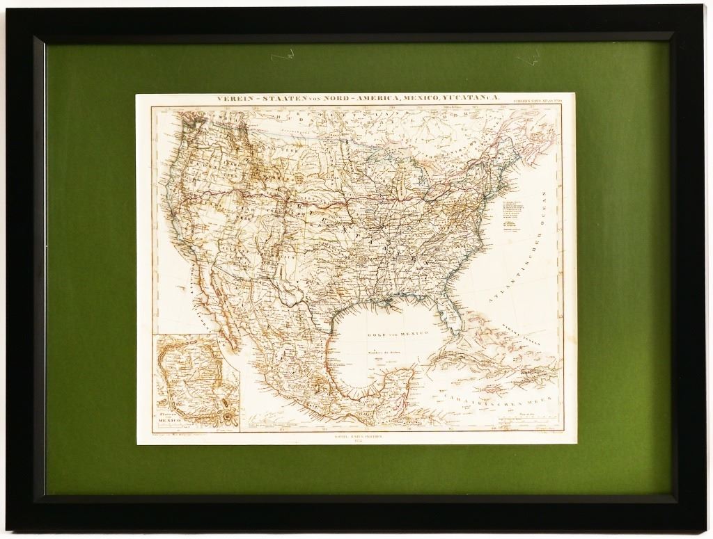 “Verein -Staaten von Nord-Amerika, Mexico, Yucatan.” By F. von Stulpnagel. Published in Gotha, Germany in 1874. Sheet measures 18-1/4” x 15-1/4”. Framed.