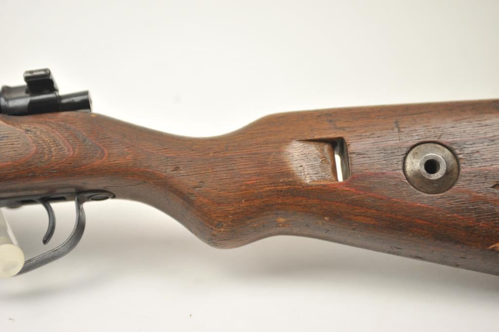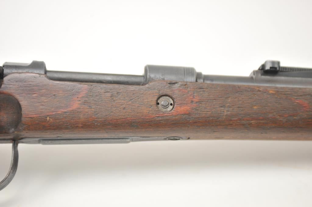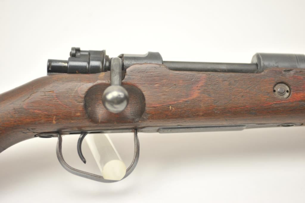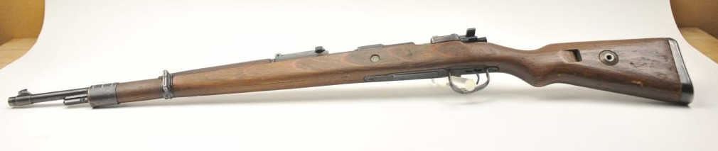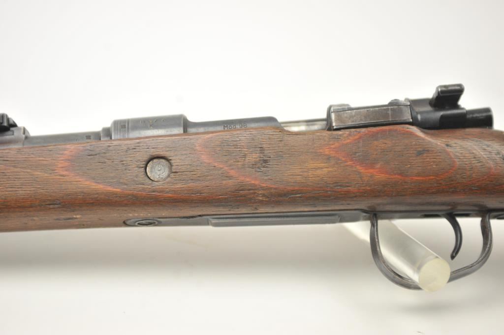German Mauser K98 bolt action rifle, 8mm caliber, Serial #8977K. The rifle is in very good overall condition with a 24” barrel with a ramped blade front and military tangent style rear sights. The front ring is marked, “dot” and dated 1944. The bolt is matching and the rifle has numerous German proofs, Nazi marks and no import marks. The trigger guard is the larger “Winter” style with possible Eastern Front service. Thesmooth wood stock is in good condition showing numerous mars, dents and “90” stamped in two places. The smooth steel butt plate is marked, “brg” dated 1941 and marked with a Waffen proof. The bore is dark and mayclean to fair, the action is crisp and the markings are sharp on this desirable WWII era K98 Mauser. Est.: $500-$1,000. (C+R).