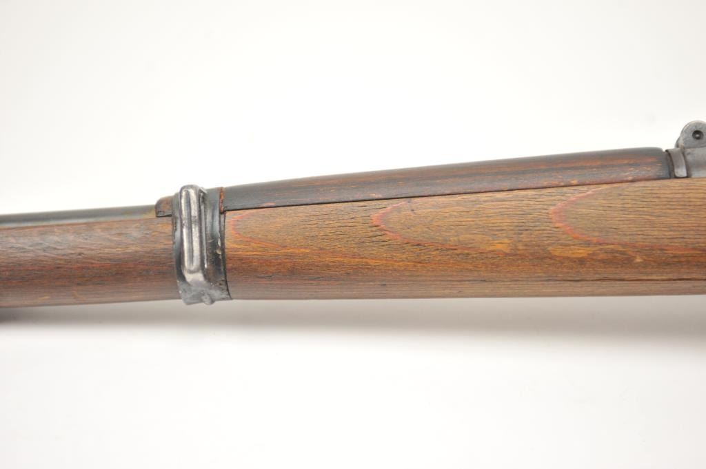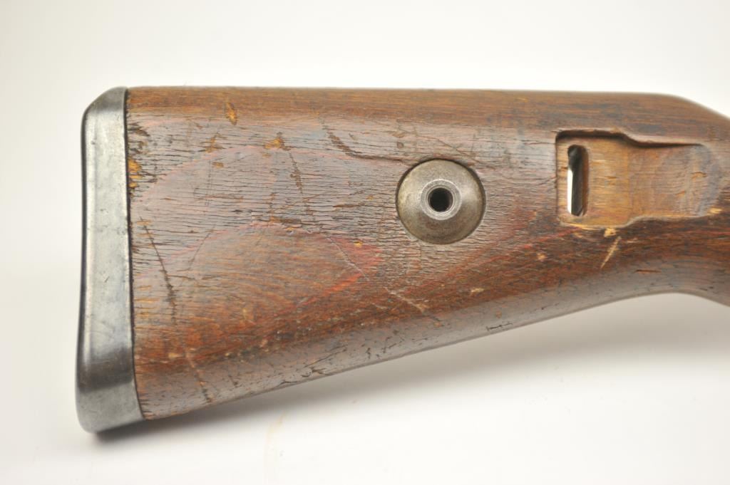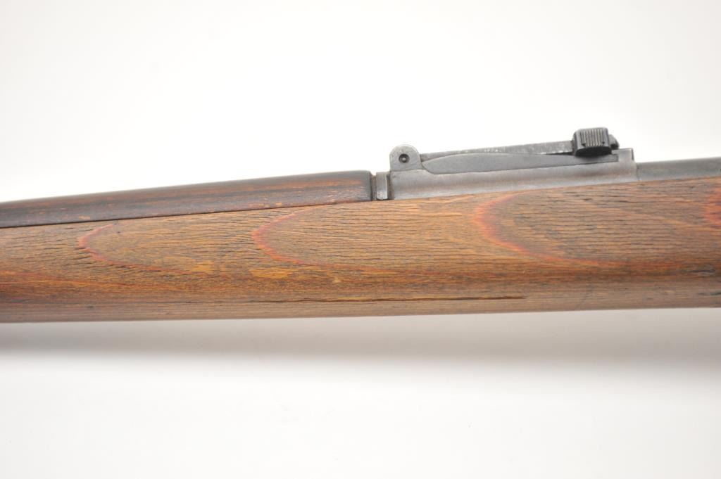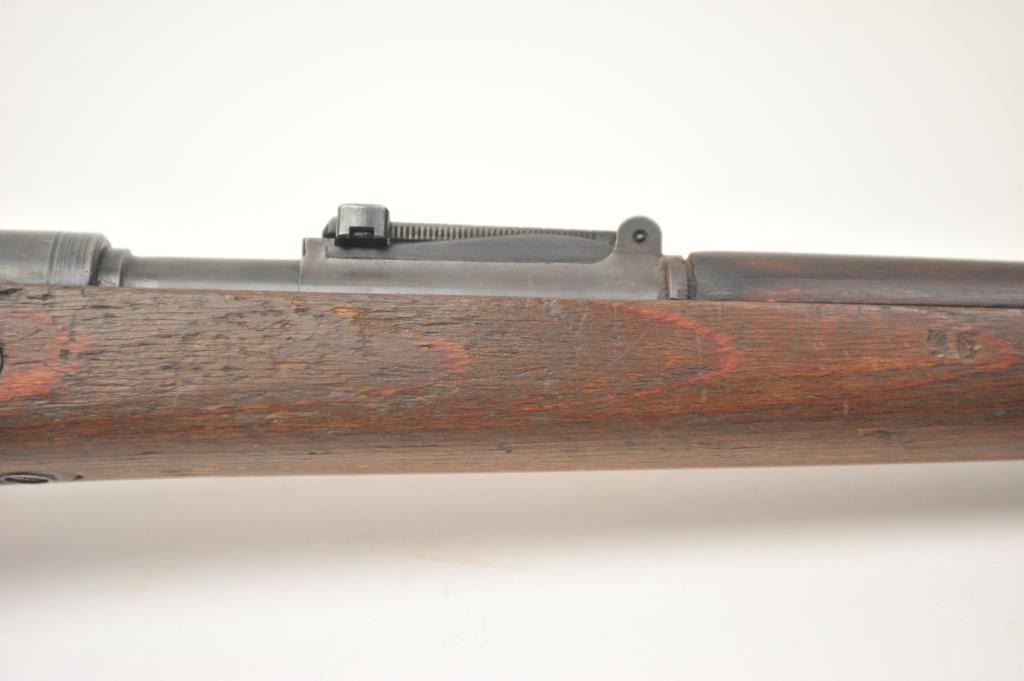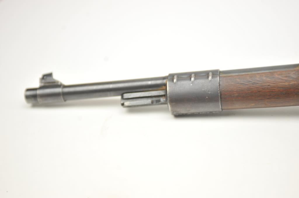 German Mauser K98 bolt action rifle, 8mm caliber, Serial #8977K. The rifle is in very good overall condition with a 24” barrel with a ramped blade front and military tangent style rear sights. The front ring is marked, “dot” and dated 1944. The bolt is matching and the rifle has numerous German proofs, Nazi marks and no import marks. The trigger guard is the larger “Winter” style with possible Eastern Front service. Thesmooth wood stock is in good condition showing numerous mars, dents and “90” stamped in two places. The smooth steel butt plate is marked, “brg” dated 1941 and marked with a Waffen proof. The bore is dark and mayclean to fair, the action is crisp and the markings are sharp on this desirable WWII era K98 Mauser. Est.: $500-$1,000. (C+R).