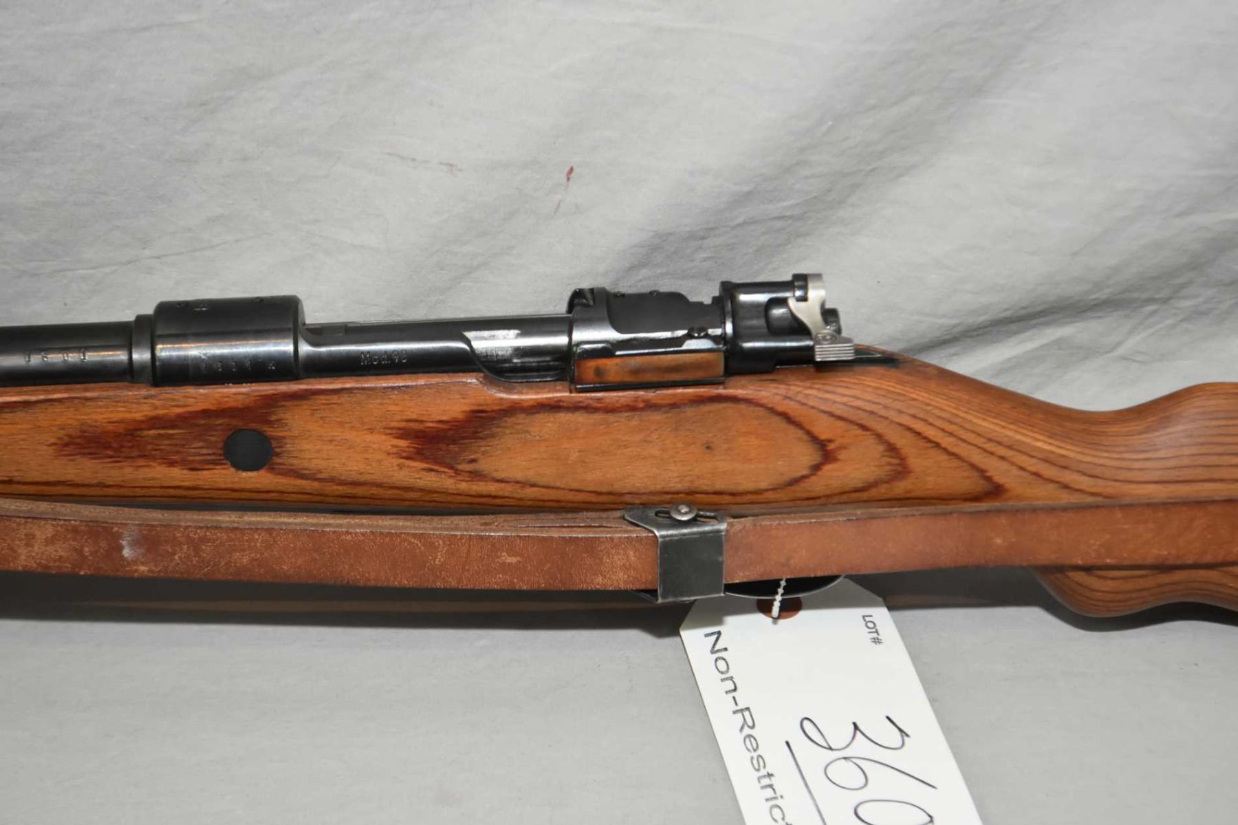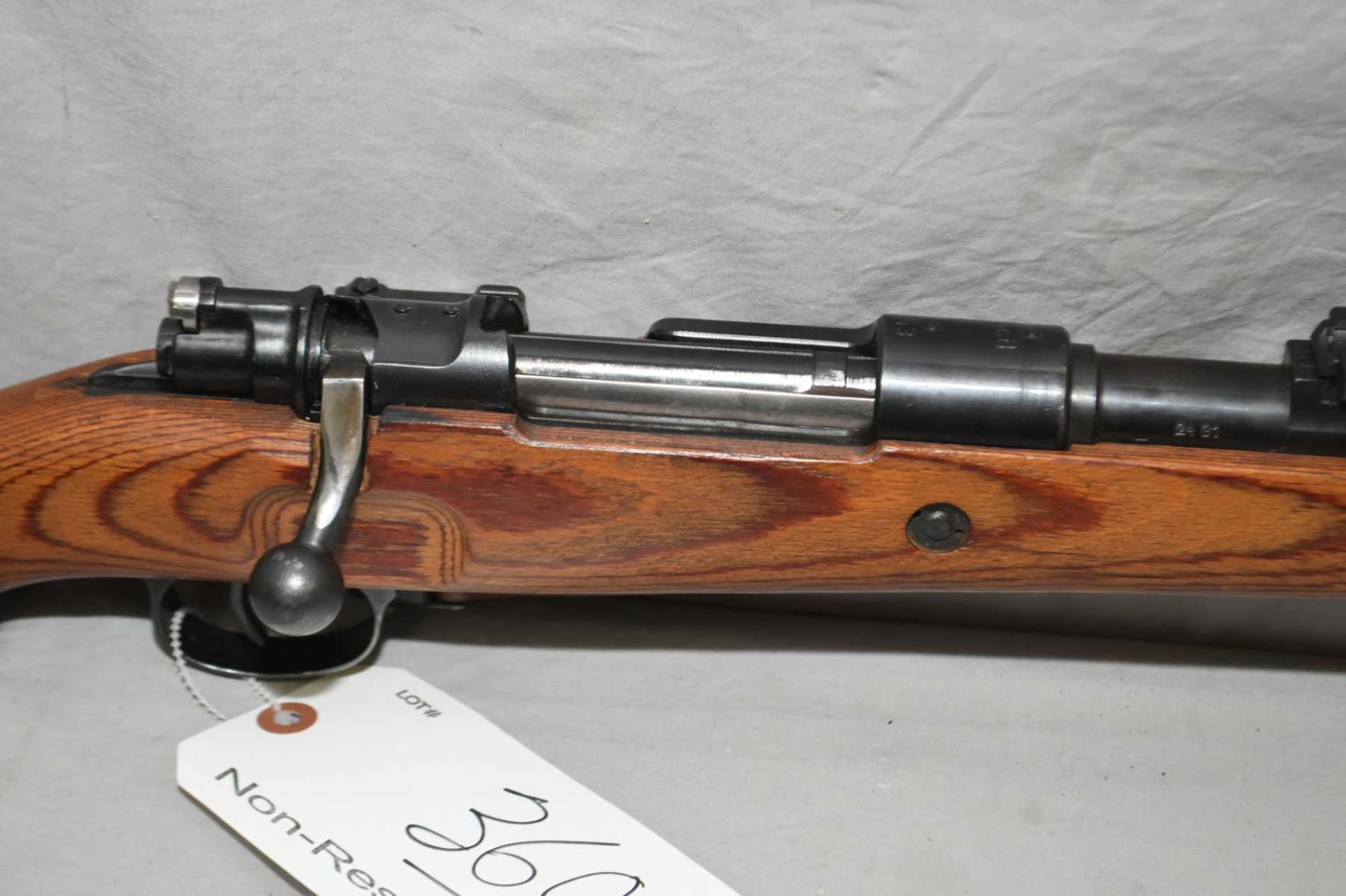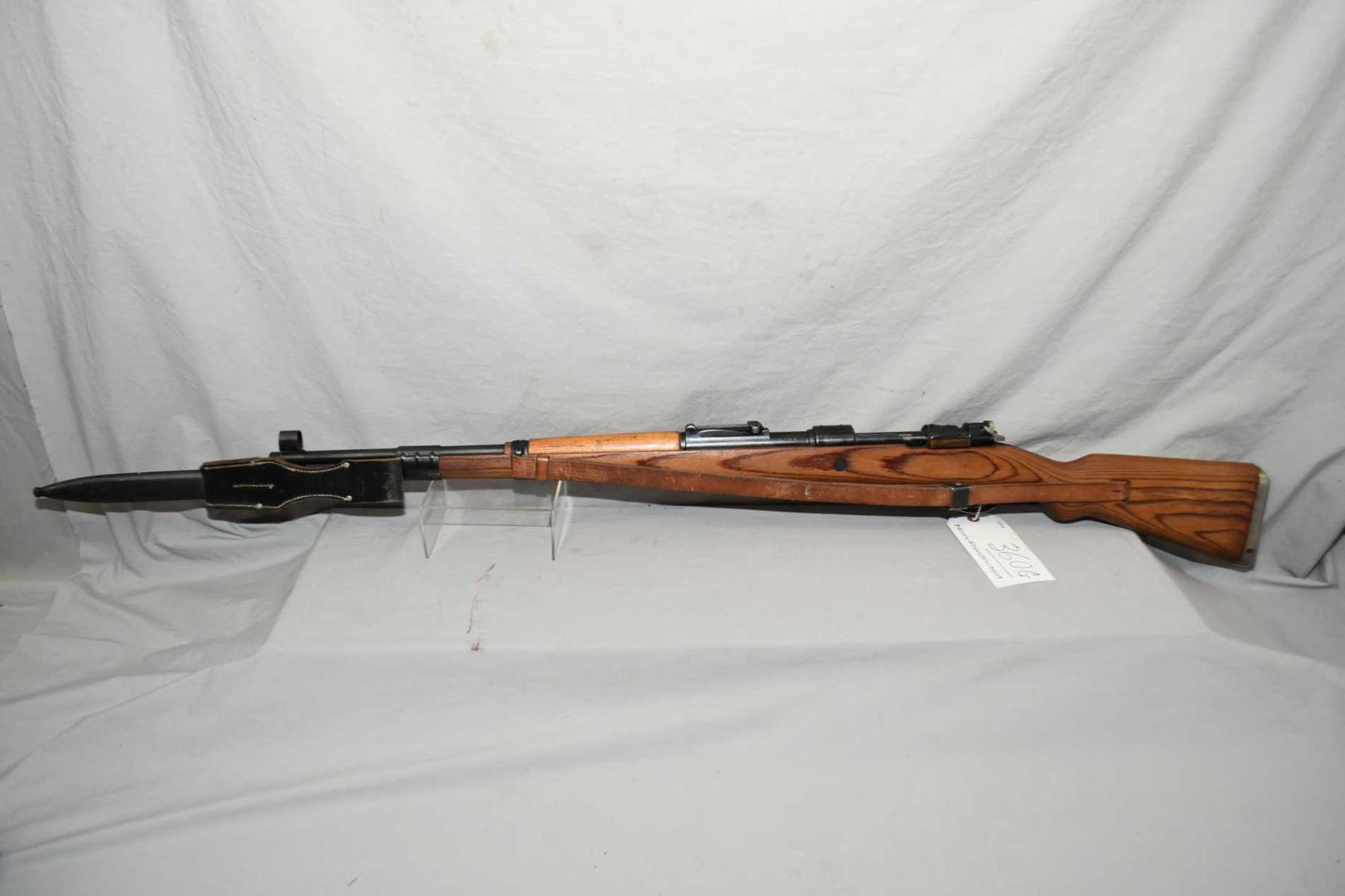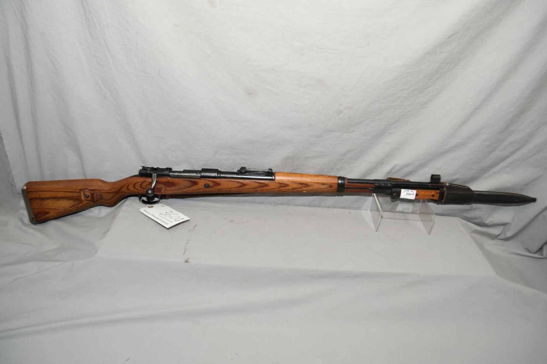 German Mauser ( bcd dated 43 ) Model 98 .8 MM Mauser Cal Full Wood Military Rifle w/ 24" bbl [ blued finish, barrel sights, bolt cut, welded and turned down, laminated pistol grip stock w/ leather sling, metal butt plate, cleaning rod, c/w non matching numbered bayonet, scabbard & frog ] Ser# 1601