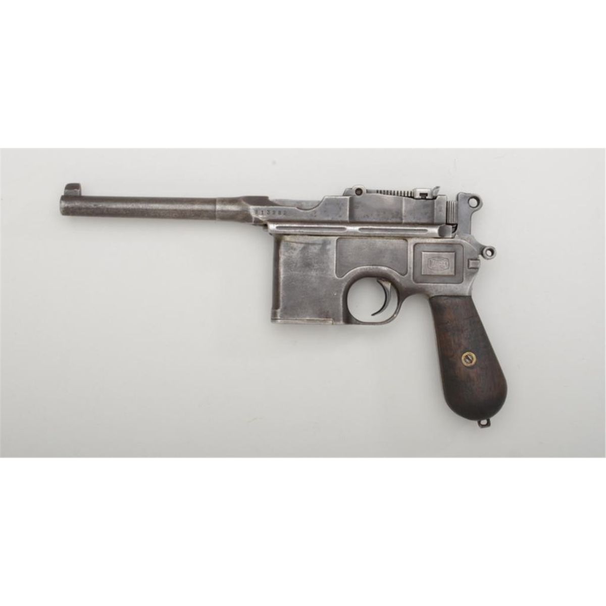German Mauser broomhandle semi-auto pistol, import-marked, brown patina finish, smooth wood grips, #813282. This gun is in overall good condition showing a brown patina on metal surfaces, some scattered pitting, darkbore, crisp action, good Mauser marking on left side of frame, worn grips. Est.: $300-$500.