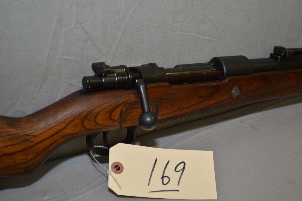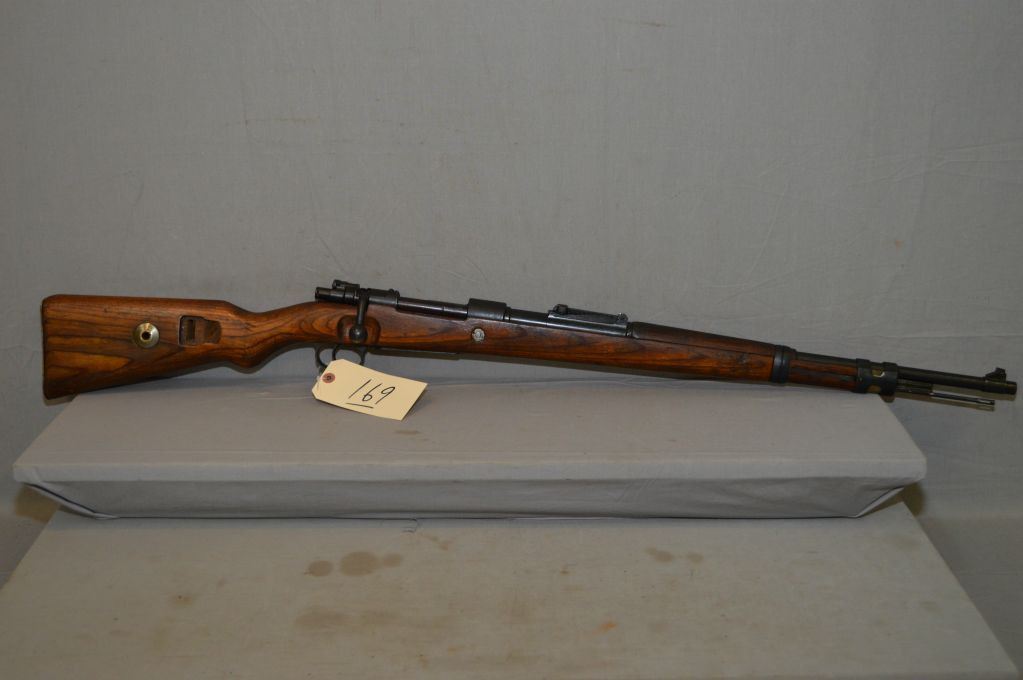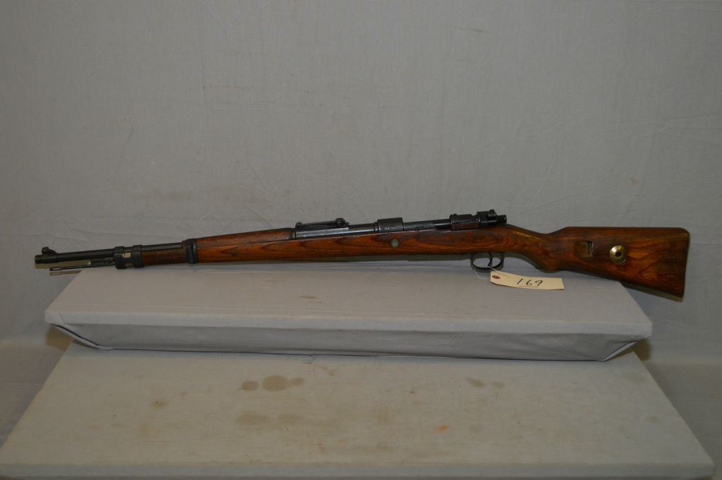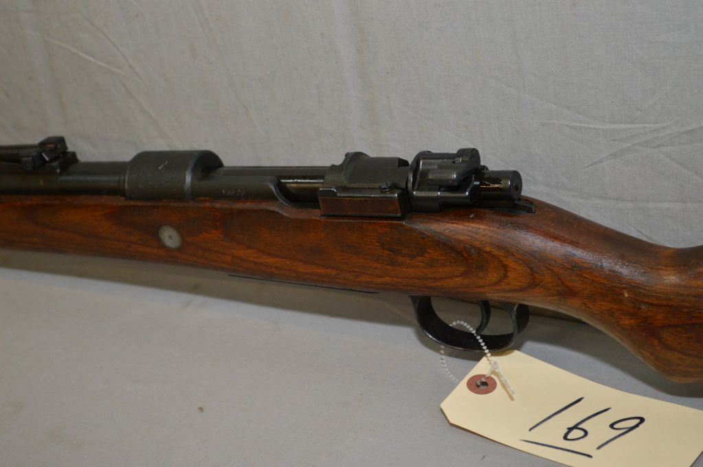 German Mauser ( dot ) Dated 1943 Model 98 .8 MM Cal Full Wood Military Bolt Action Rifle w/ 24" bbl [ Nazi marked on bbl, but Xed out on receiver, mis-matched numbers, but wood matches receiver, blued finish, barrel sights, good wood w/cleaning rod ] Ser # 2896
