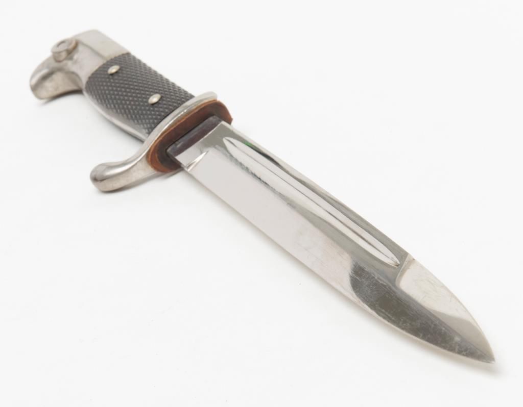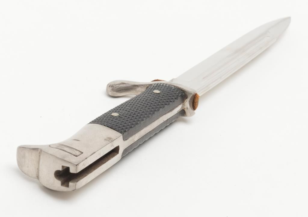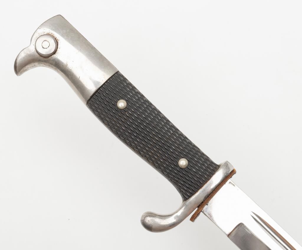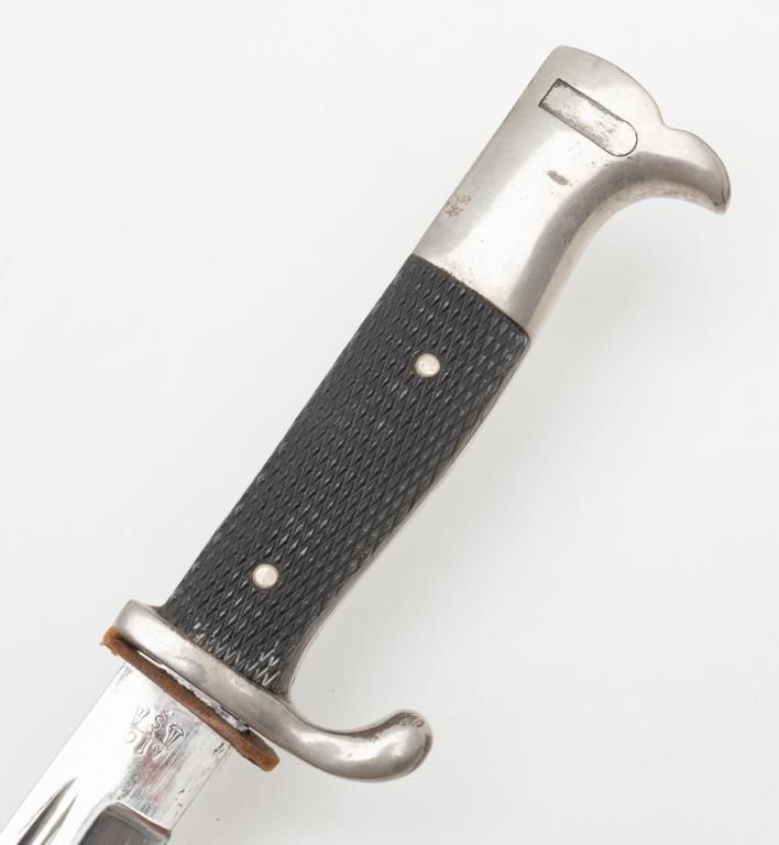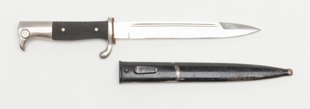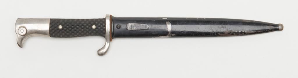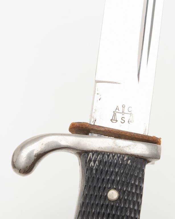 German Mauser dress bayonet with metal sheath in overall good to very good condition showing considerable original polish on the blade, ACS on scales marking, considerable original black finish on sheath. Est.: $75-$150.