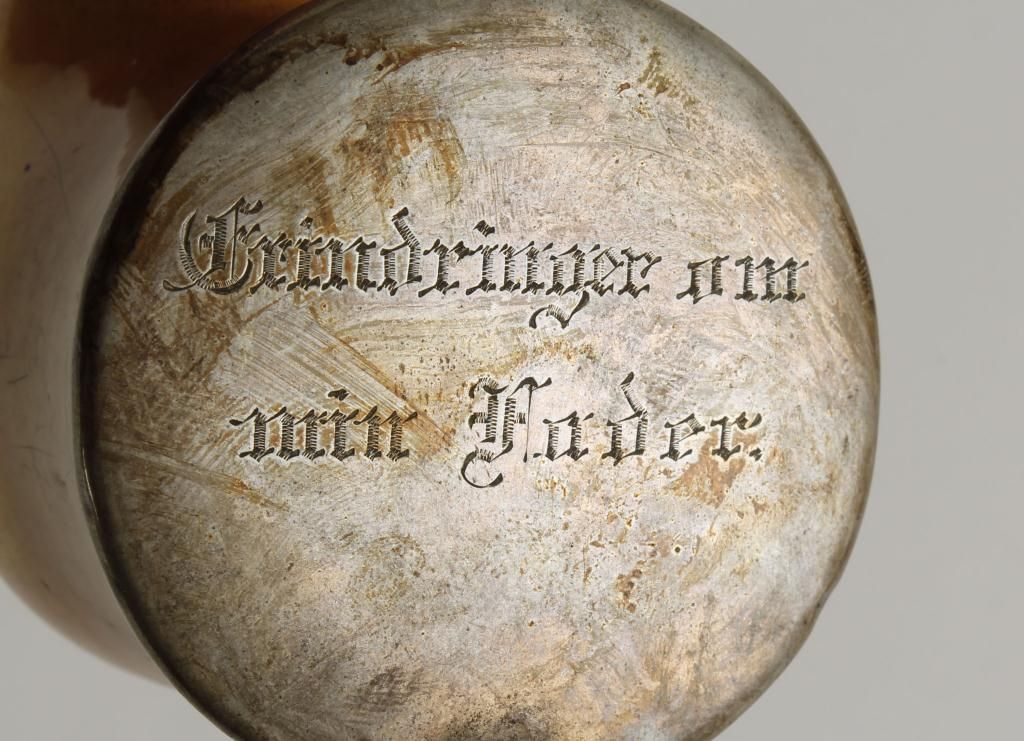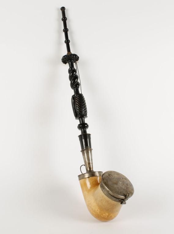Silver mounted, fancy carved stem with horn bit, overall 18 1/2"L, "Grindringer muir Foder" on lid.