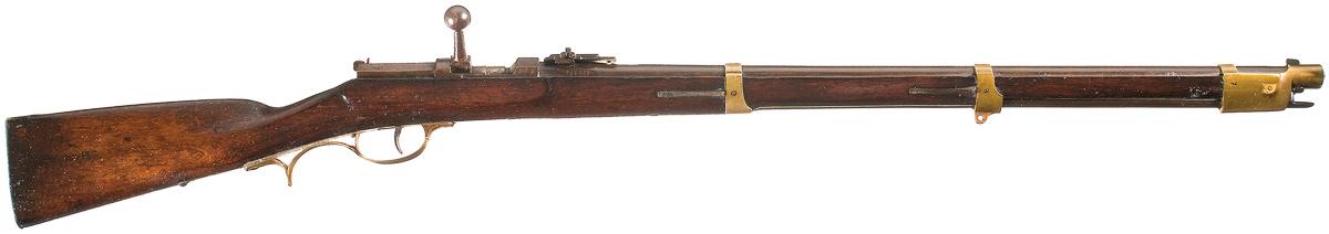 The left rear side of the receiver is marked with a spread winged eagle over "SPANDAU", with the reverse having "1857" in large font followed by a small "1861". "Stahl" is stamped on the barrel behind the 5 leaf rear sight (4 are folding leafs), with crown/letter proofs on right side. A steel sliding bayonet is retained beneath the muzzle. The three barrel bands and trigger guard are brass. Serial number on receiver (734) with the barrel bands and barrel numbered "2251" and the buttplate numbered "7341".