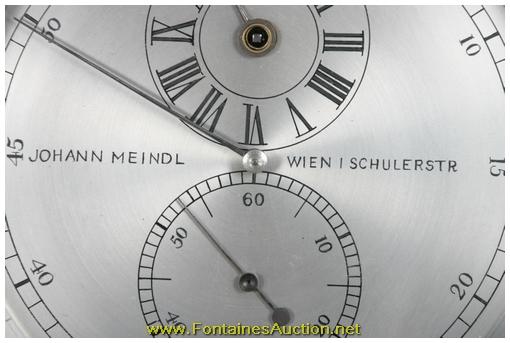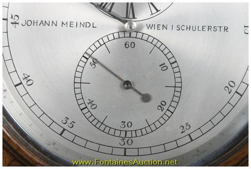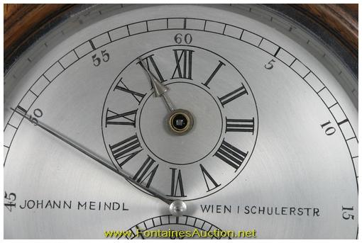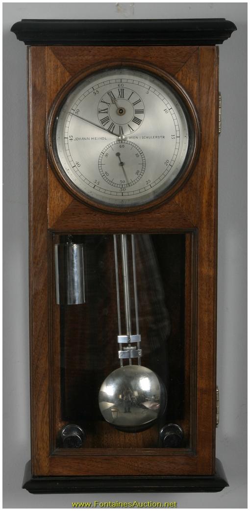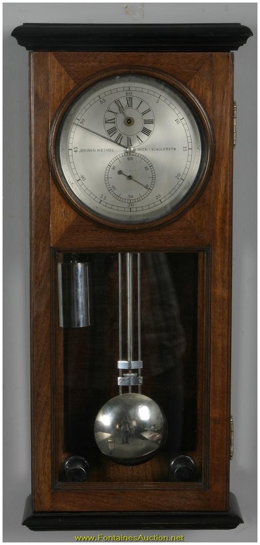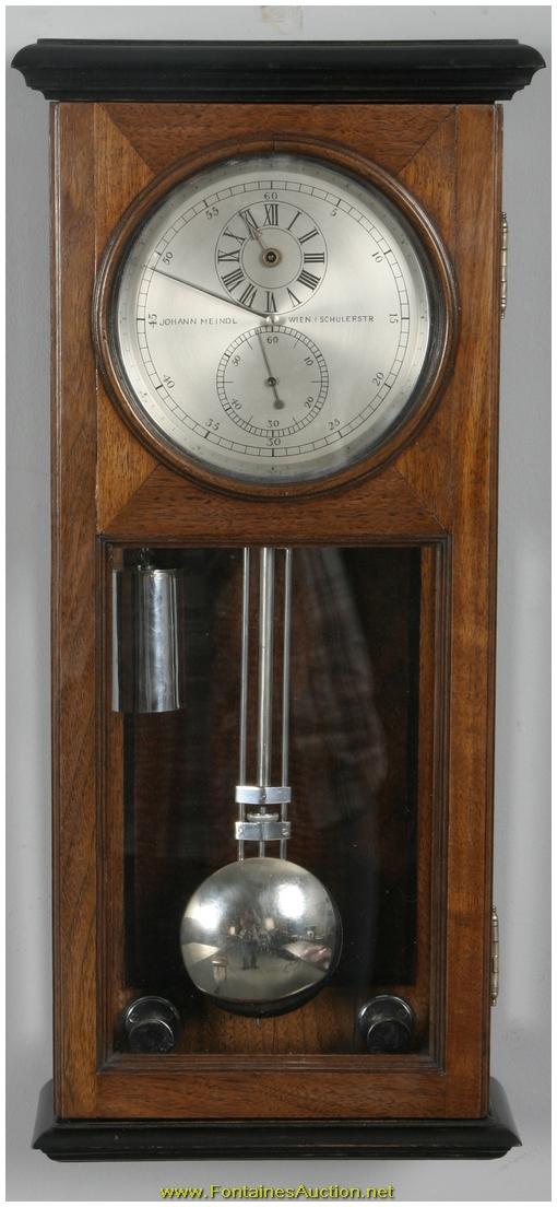 German Miniature Walnut Astronomical Regulator. 5" Silvered dial, chapter ring indicates the minutes with black Arabic 5 minute marks, sub seconds dial with Arabic 10 second numerals and sub hour dial with roman numerals, clock winds through the hour hand arbor hole; dial signed "Johann Meindl - Wien I Schulerstr". Quality brass astronomical movement and mount; silvered bezel, weight, pulley, level screws and gridiron pendulum. In a beautiful walnut case with ebony trim. In pristine condition. 10"W x 21.5"H x 4.5"D. Estimated Value$10,000 - 15,000.