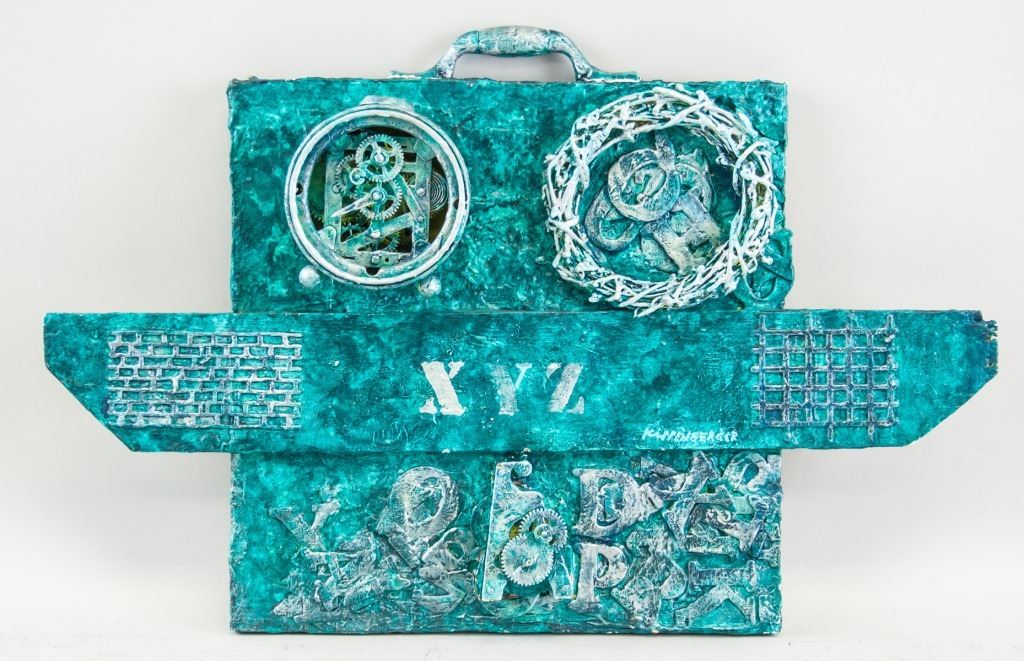 Mixed media. Featuring abstract composition of different media all painted a green-blue tone. Signed "Kippenberger" to the right. 34 x 52 cm (13.5 x 20.5 inches).