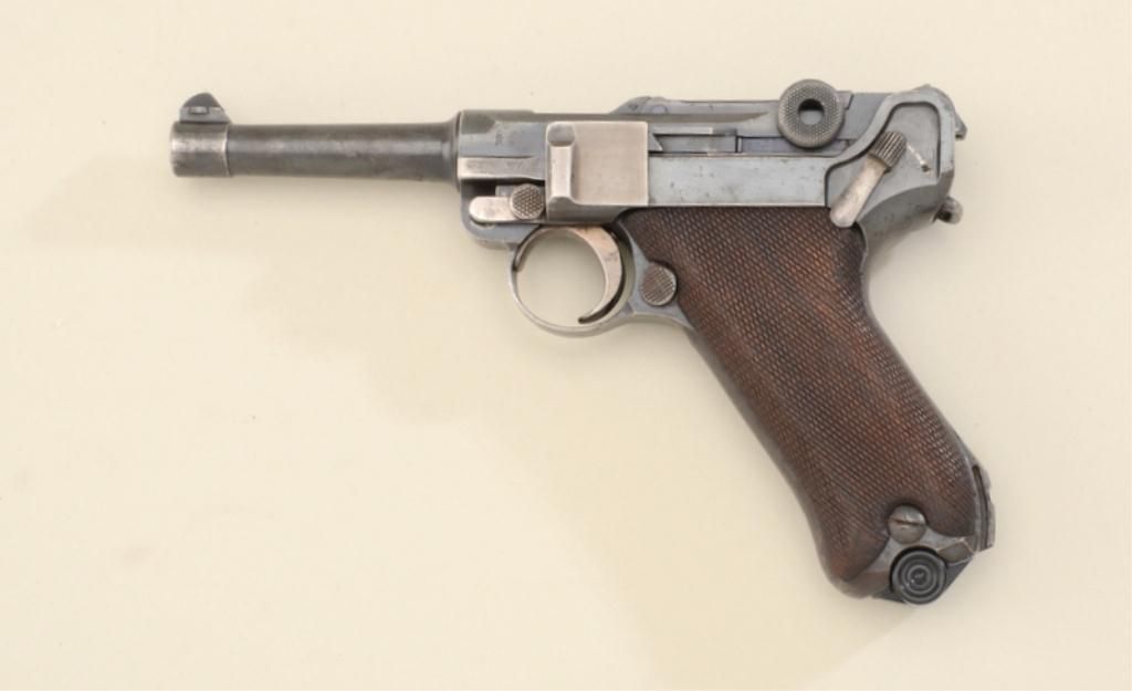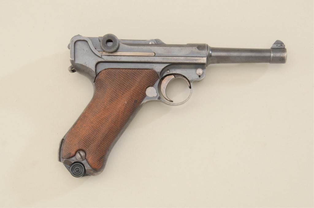 German Model 1920 Commercial Luger, .30 cal, serial #9323. Shows crown "N" and Germany for export between WWI and WWII. Good to very good. condition with 75% to 85% original blue. Showing normal age and use. Good grips, good markings, fair to good bore showing some erosion and wear but may cleanup. Clip is a black plastic bottom, unmarked old replacement. No import marks. Est. $600-$1,200