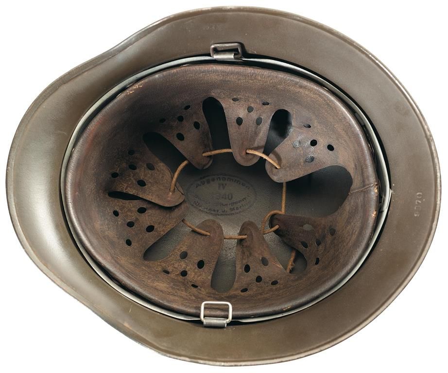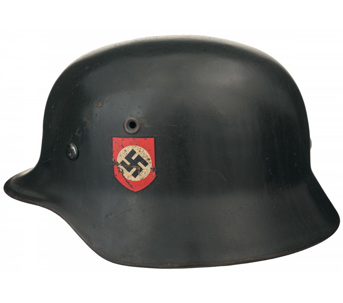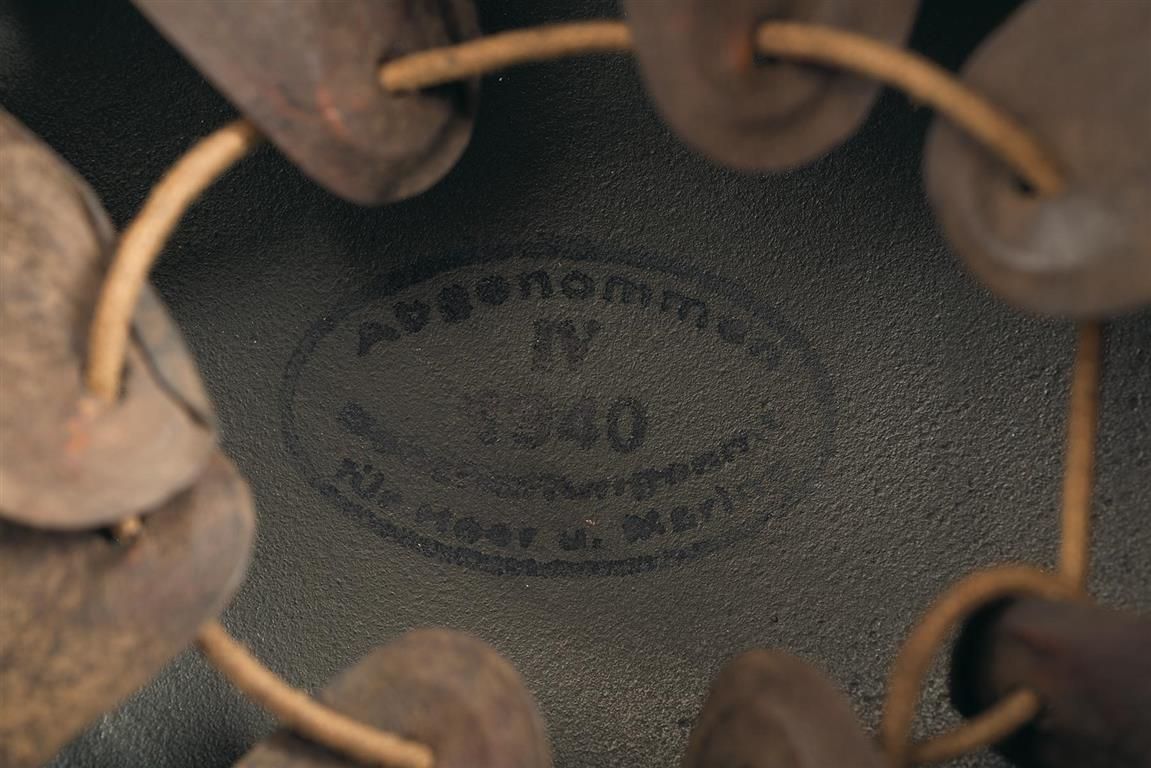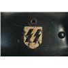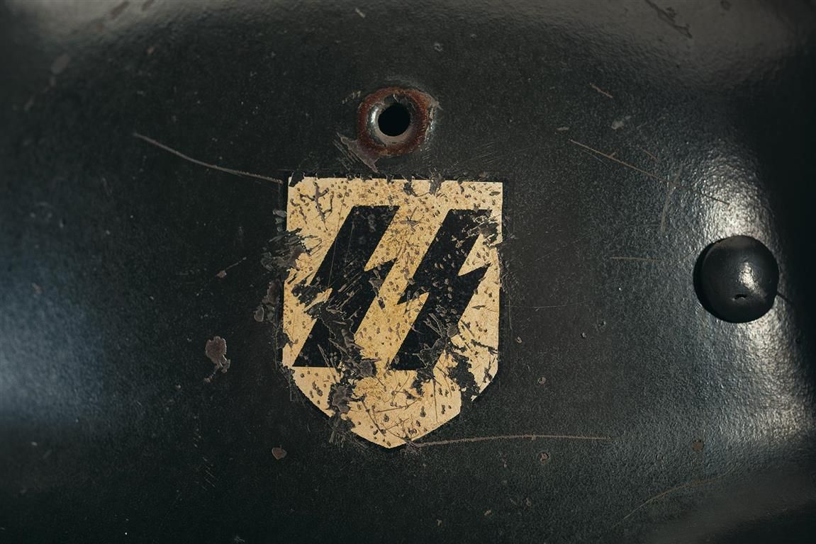 Finished in a deep green bordering on black, with the red, white and black Nazi Party shield decal on the left side of the helmet and the black on silver SS rune shield on the right. The underside of the brim is stamped "EF66" on the left and "9070" on the rear, with brown leather webbing and a black stamp inside the crown reading "Abgenommen/IV/1940/Beschaffungsamt/Fur Heer u. Marine."