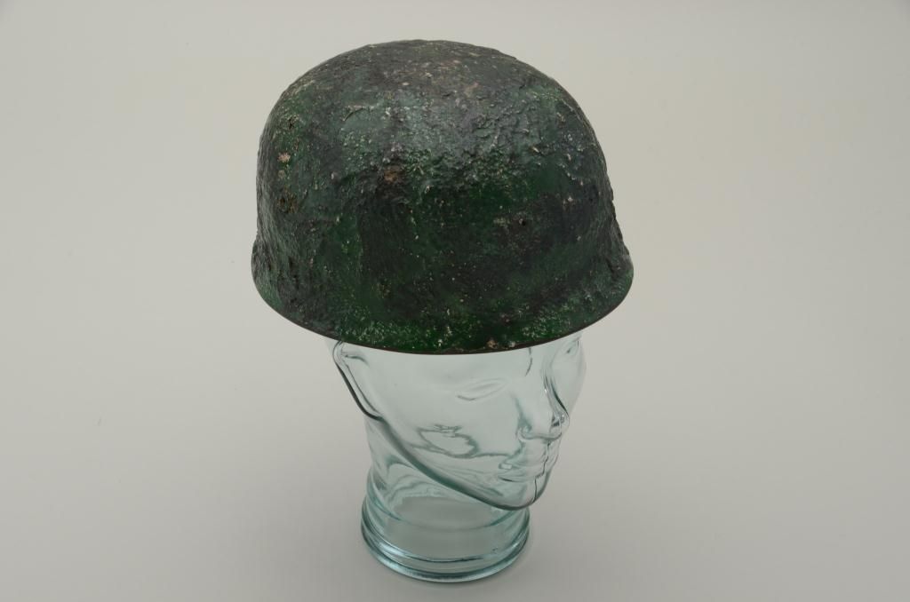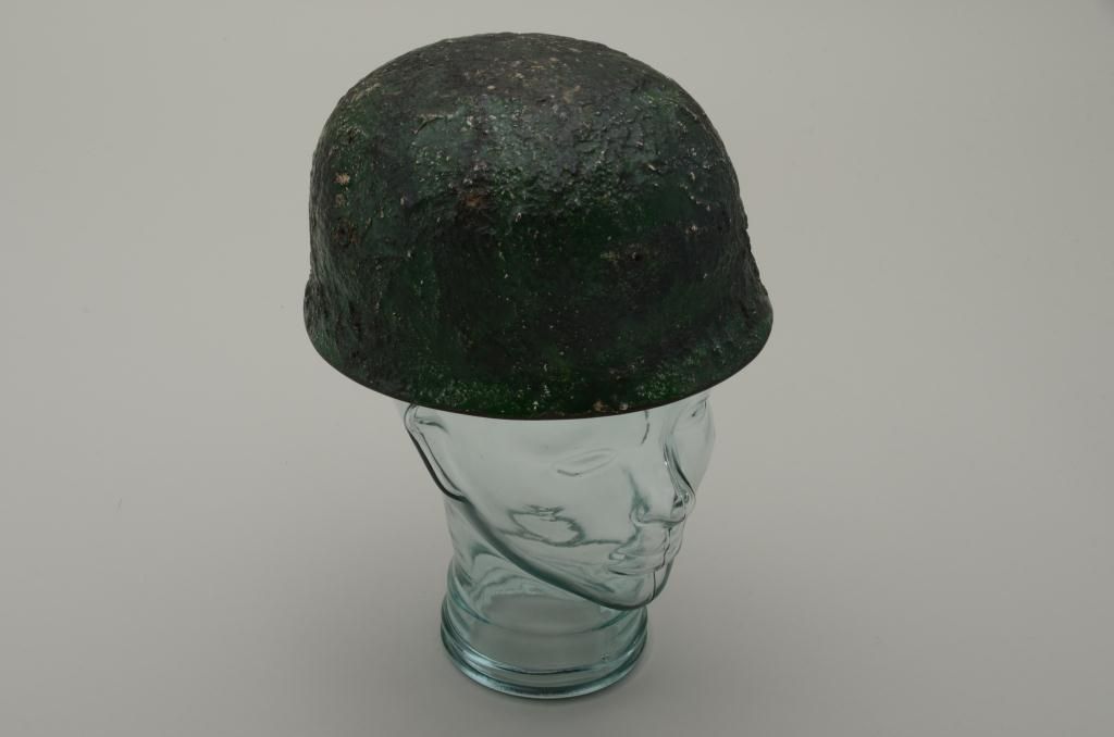 German Model 38 paratrooper helmet for Luftwaffe showing thick green camouflage paint mixed with sand to give it a rough textured finish. The liner retaining bolts are the Spanner type used in the early warprior to the introduction of the slotted bolts. The inside liner shows two manufacture stamps; one for Karl Heisler the liner producer and the other is a factory lot number and the liner is re-stitched down themiddle with black thread. There is also a manufacture stamp for A. G. of Thale on the inner left sides of the shell. One of the most desirable of all World War II era helmets with unique in theater painted camo.Est.: $2,000-$4,000.