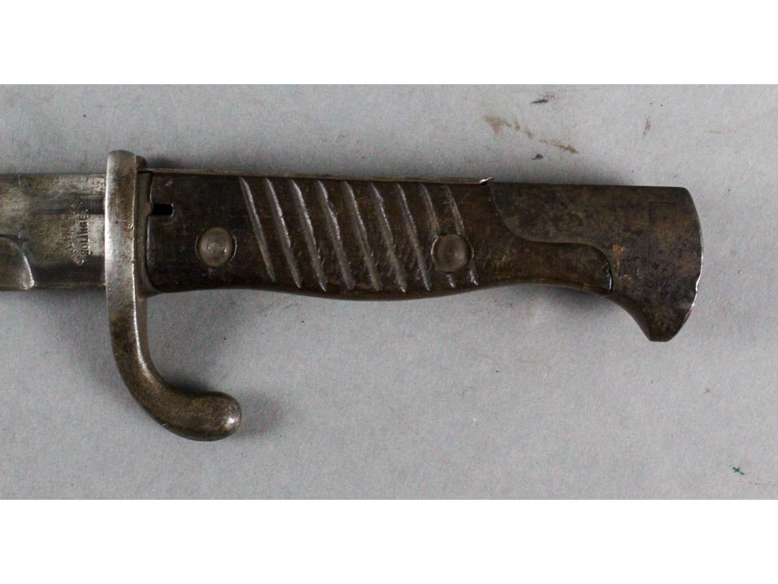 Blade measures 14.25", overall 20.5". Made Carl Eickhorn Solingen, 1916. Blade sharpened and shows age staining. Grips, crossguard, and flash guard show wear usage. Pommel shows some rust and small dent. Metal scabbard missing screw, rusted, and heavily dented.