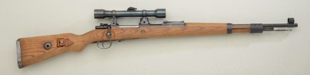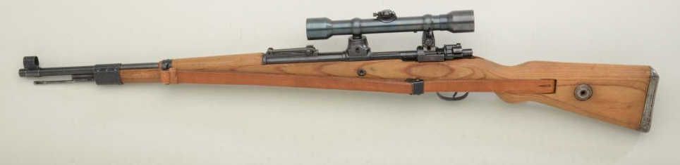 German Model 98K sniper rifle, serial #513C, with quick release turret type mount, serial #513C. Shows unmarked Hensoldt type scope, 2 Nazi eagle proofs, one on breech and one on rear of barrel. The metal surfaces retain98-99% arsenal blue finish, the stock still fuzzy and near excellent with just a couple of storage type dings and mars; it is a light un-oiled color with no inspections or proofs. The bolt and safety are numbered tomatch, as is the trigger guard and floor plate and all visible numbers. We were unable to remove the mounts to inspect the manufacturer on the breach. The interior of the rifle is excellent to near unused, andthe scope shows most of its original finish also. From a major old time military collection. Est.: $3,500-$7,000