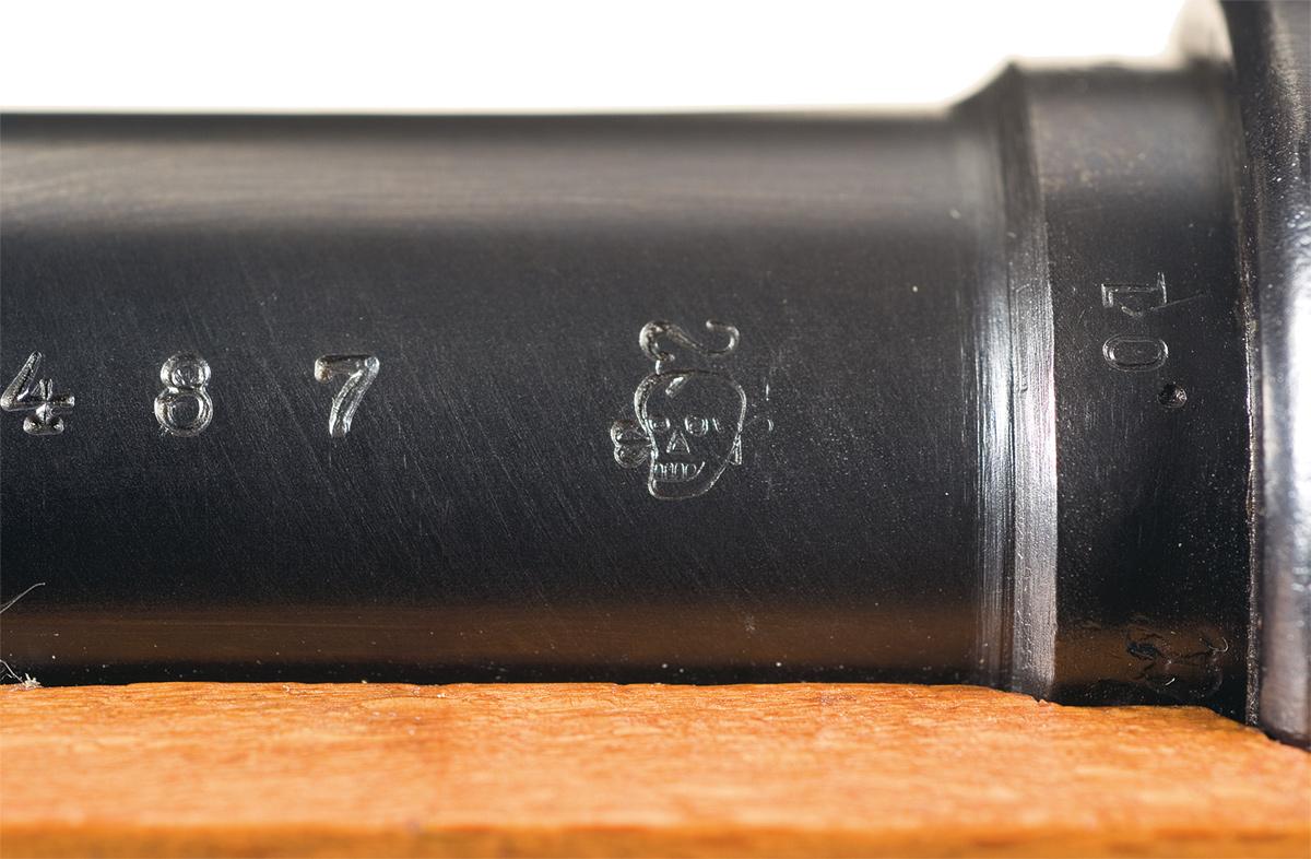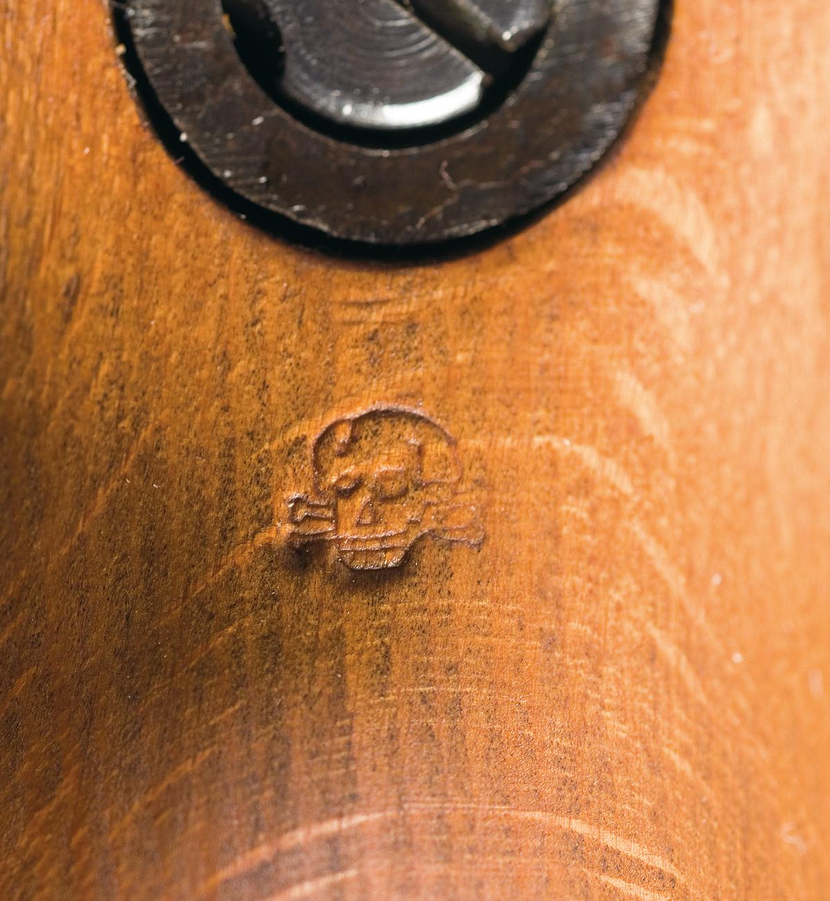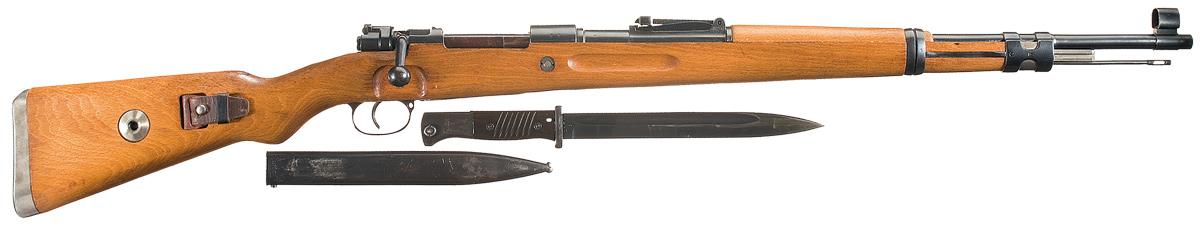 This is an example of a World War I GEW 98 rifle that has been arsenal reworked in the 1930s for the SS. The barrel has been shortened to 24" and a tangent rear sight installed. The top of the receiver ring is blank and the left side is marked with an Imperial eagle, the serial number, a "crown/N proof and the crown of another proof visible. The right side is marked with three crown over script letter proofs. The left side receiver wall is marked "GEW 98.". The left rear of the barrel is marked with the matching serial number and the lazy S/deathhead stamp, the right side is marked with an "eagle/20" proof mark. Matching numbers on most parts, the floor plate and attaching iron have been renumbered to match. All parts are milled, hooded front sight and tangent rear sight is graduated to 200 meters. Mounted with a pistol grip walnut stock with cupped buttplate and skull and cross bones stamp in the wrist. Complete with a slotted cleaning rod, brown leather sling and bayonet with metal scabbard. The bayonet has a serrated Bakelite handle and is marked "1676 / a" on one side and "MUNDLOS" on the other. One throat end side of the scabbard is marked with the matching number and the other "MUNDLOS / 39".
