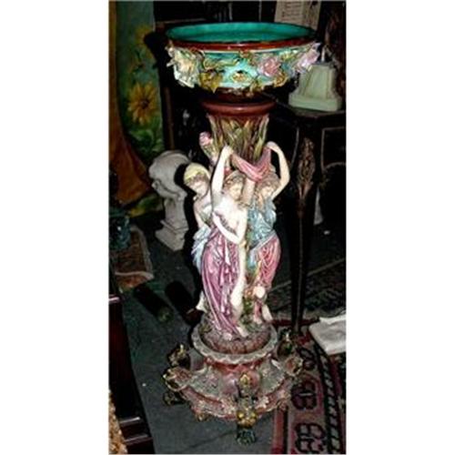 The most exquisite German Faience Planter we have ever found , measuring 41 inches tall and 14 inches wide, features detailed stunning carvings in the Botticelli´s style with three maidens, Faith, Hope, and Charity, dancing in a circle ( Canto 30 of Dante´s Divine Comedy)... simply great ! According to the Kovels guide page 207 mark h, the Mark belongs to a German company working in 1882. Great Condition for 125 years old !!! probably the last of its kind in such conditions, shipping within U.S. is $ 395 .. sorry but requires professional packing .
