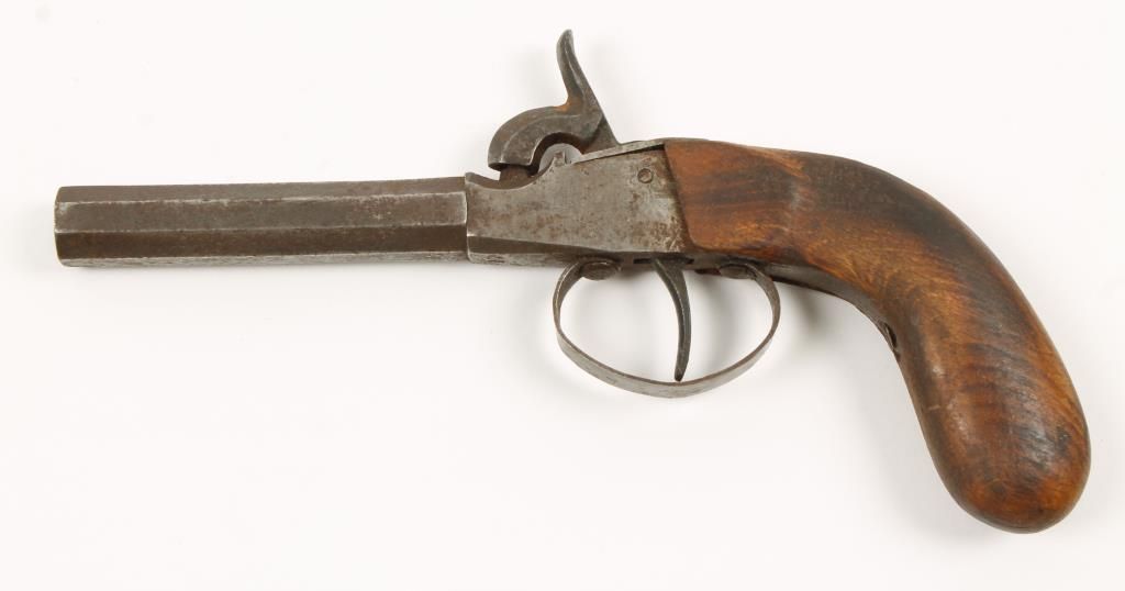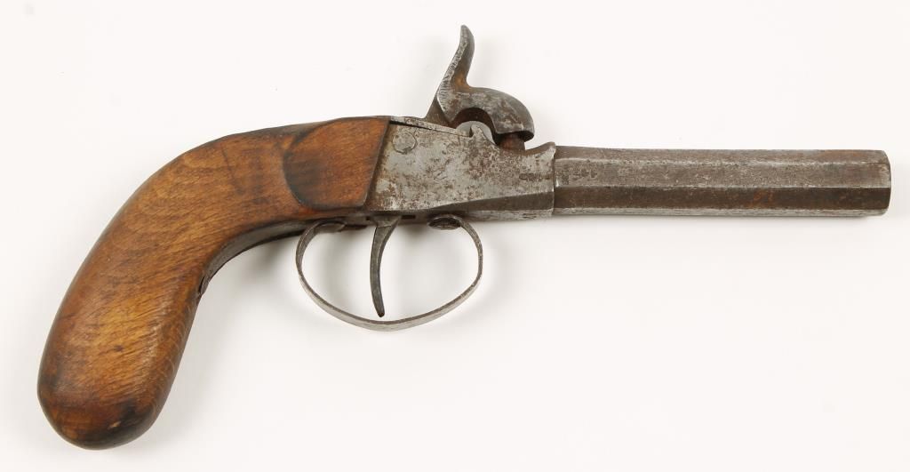 Single shot cap and ball pistol with German crown over U proofs. Center hammer. Steel has no remaining finish. Surface rust present. Wood grip has no finish, is worn and shows some scratches. Action works but is hard to work. Condition: Poor to fair. *Antique Firearm*