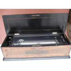 <b>Description: </b>German Music Box, Flowers on top, inlay and flowers on front painted, working condition, case has some paint loss and veneer damage , front of case sun faded, black interior, number of tunes unknown. 11.5" x 30.5" x 8.5"