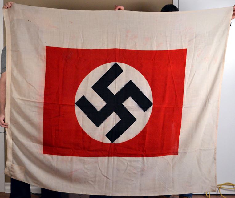 Germany, Third Reich, flag, 150mm x 180mm, white outside, red circle,with Swastika in middle, black stitching on backing, "Sig. Fl. Delta", "T.J.B. Viersen", with tag, "WestDeutsche Fahnen-Fabrik, Bonn"; VG to Fine, a few small holes, some dicolouration and light stains.