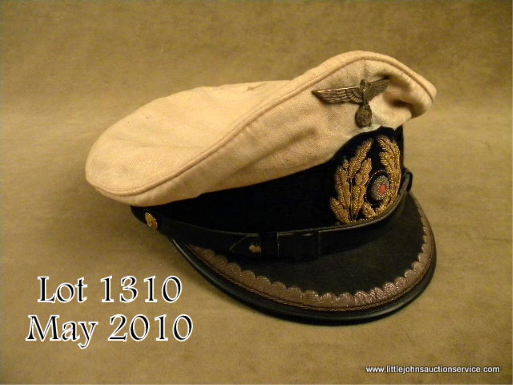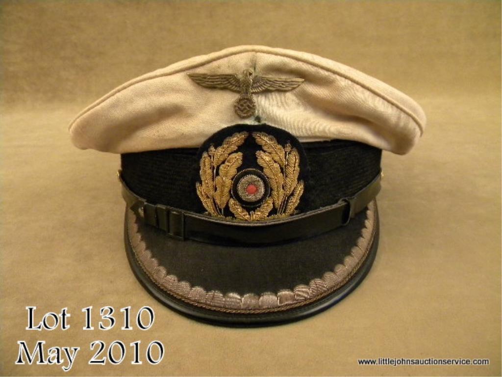 German Naval officer’s white-topped visor cap complete with insignia, chin strap, and bullion-embroidered visor trim. Shows heavy wear from period use. Has “Leutnant Zur Sek Friedrich-Karl Teichmann” ID with officer’s nameon the inside. Est: $800 - $1,200