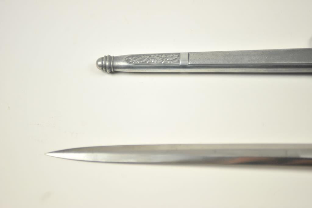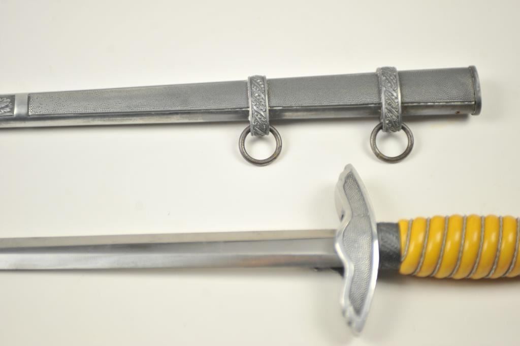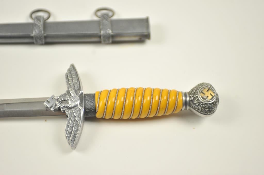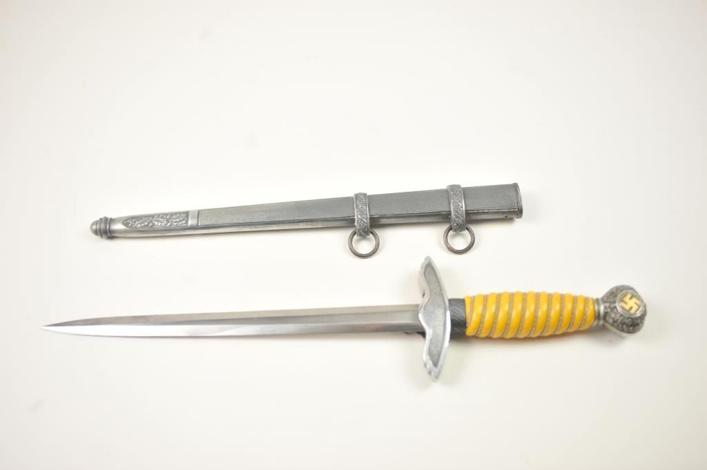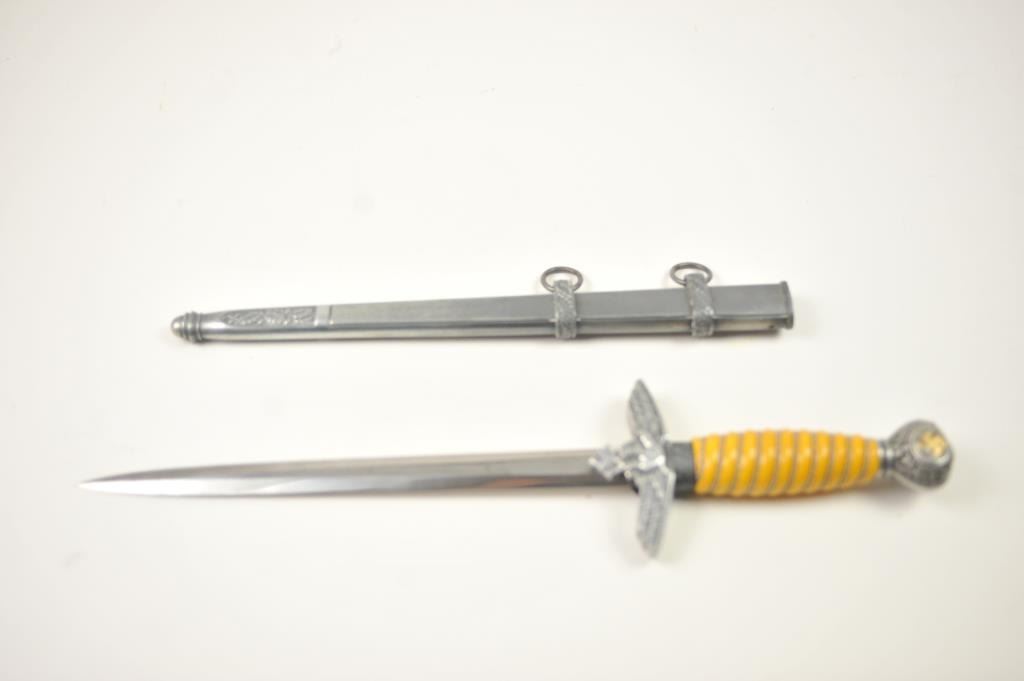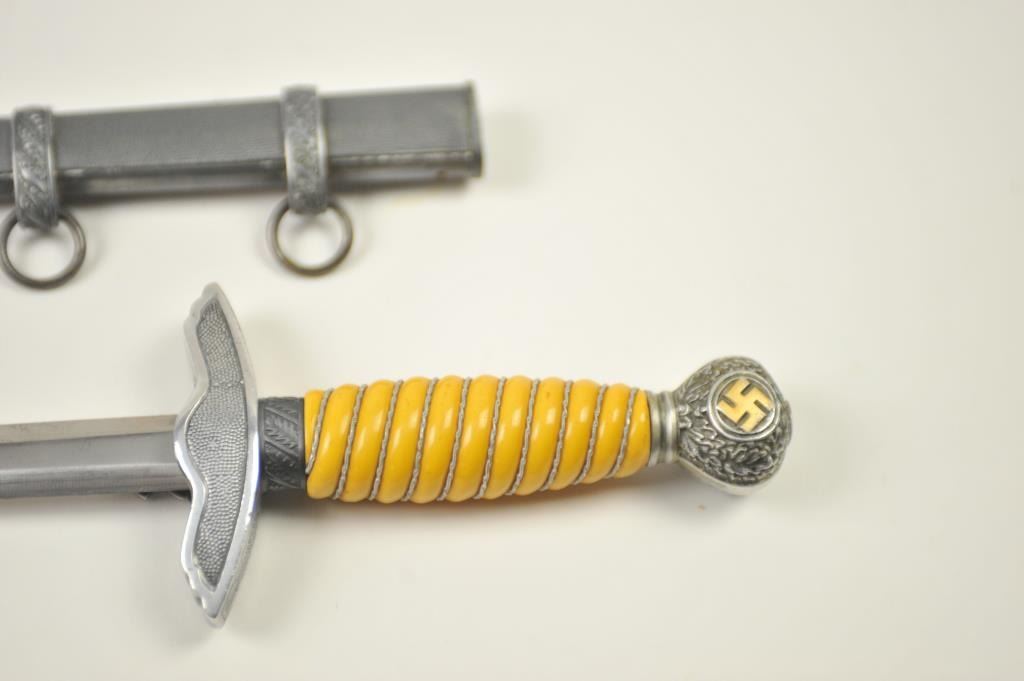 German Nazi era Luftwaffe dagger with “Eickhorn Solingen” maker’s mark. Very good plus to near fine condition with pristine grip and slightly toned scabbard. Est.: $300-$600