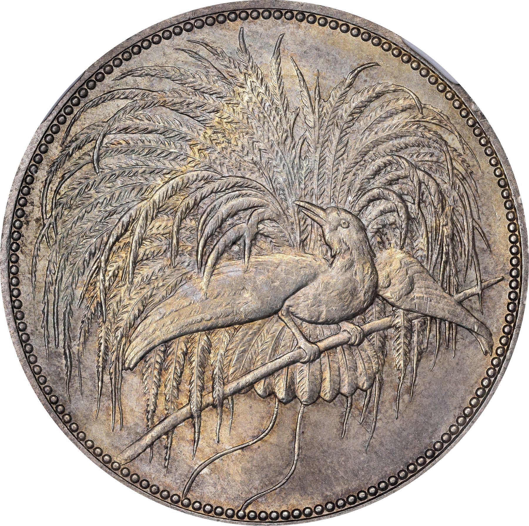 Description: A final denomination entry in the line-up of Gem German New Guinea silver coinage offered here. The largest of the four silver Bird of Paradise issues in size and denomination, the present beauty is a satiny and lustrous display of pearlescent gray-gold. Easy on the eye and nicely struck, two qualities to look for in Gem coinage of any type. One of 19,000 struck, and easily among the finest examples extant today. Don’t let this bird fly away!