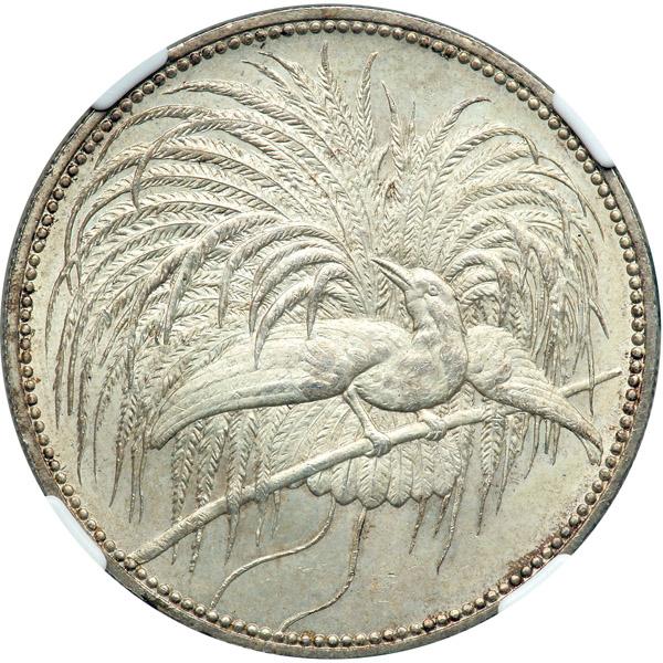 German New Guinea. 5 Mark, 1894-A. Dav-429; KM-7; J-707. Value and date within wreath. Reverse: Bird of Paradise. A splendid original frosty mint lustrous example. NGC graded MS-65.