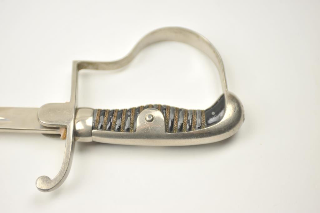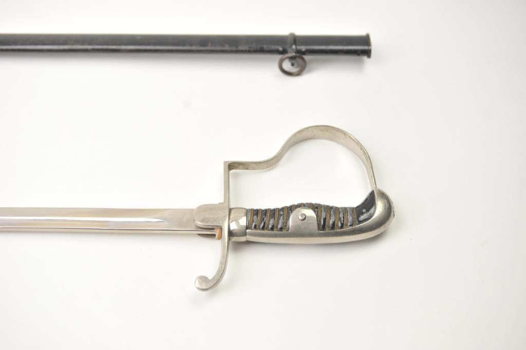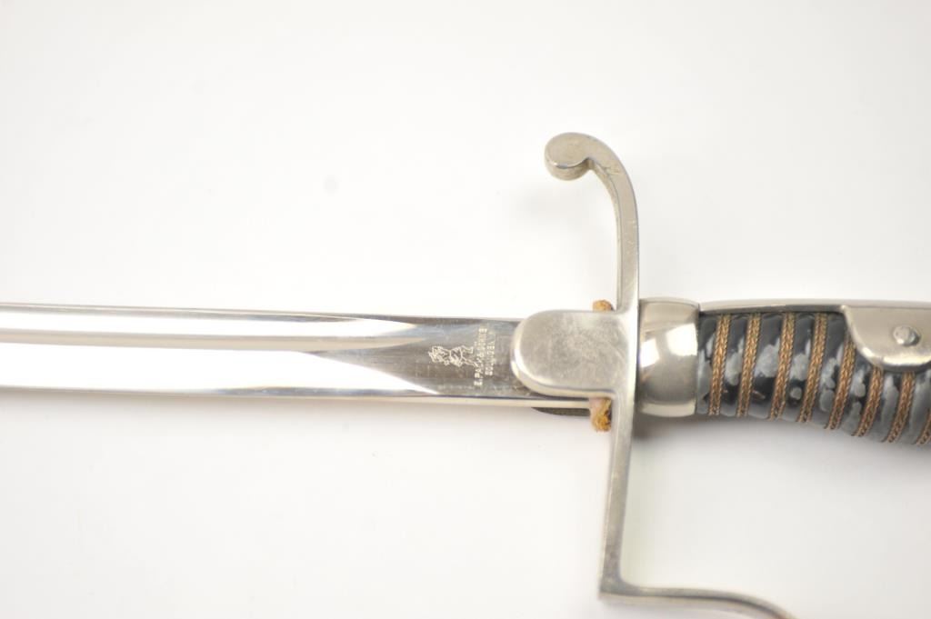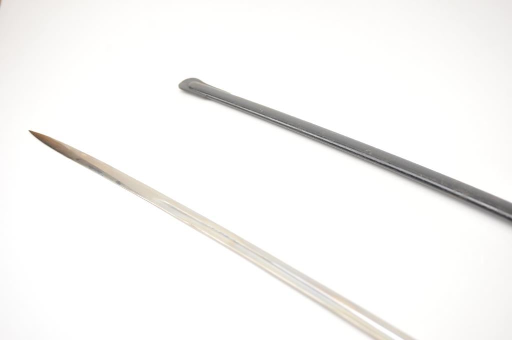 German Non-Commissioned Officer’s sword with metal scabbard. The sword is marked, “E.PACK & SOHNE SOLINGEN” at the handguard. The blade is excellent, while the sword and scabbard are very good overall. The piecedates to 1920’s-to WWII era. Est.: $150-$300.