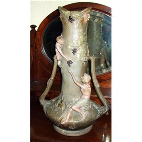 Faience BY Johann Maresch,b-1821,Baehr and Maresch Siderolith Fabrik was located in the town of Aussig an der Elbe,in the German Empire a part of Bohemia and now in the Czech Republic,. Originally they marked their wares with B a M, around 1863, they switched to the famous JM markings. The factory was considered a siderolith because they used an "ironstone" clay mixture; a type of porcelain that is more durable, having more strength and weight than fine porcelain. This beautiful vase measures 23" tall, has been professionally restored , don't ask me for pictures of the restoration , we cannot see it neither the camera can.It is a piece of Art , carved with exquisite detail , a master piece of the Art Nouveau . Shipping within US $ 175