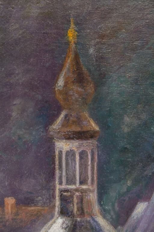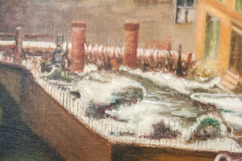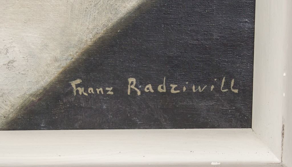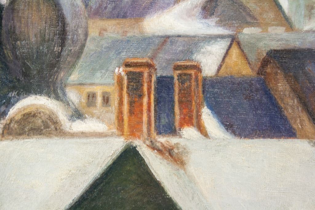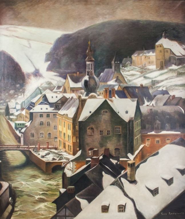 Oil on canvas, framed. Featuring European city scene with snow on the rooftops. Signed "Franz Radziwill" to the bottom right corner. Canvas size: 100 x 85 cm (39.5 x 33.75 inches). Frame size: 110 x 95 cm (43.5 x 37.5 inches).