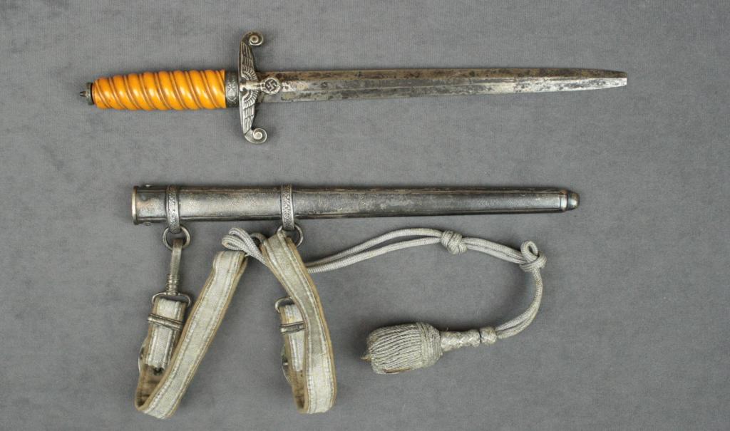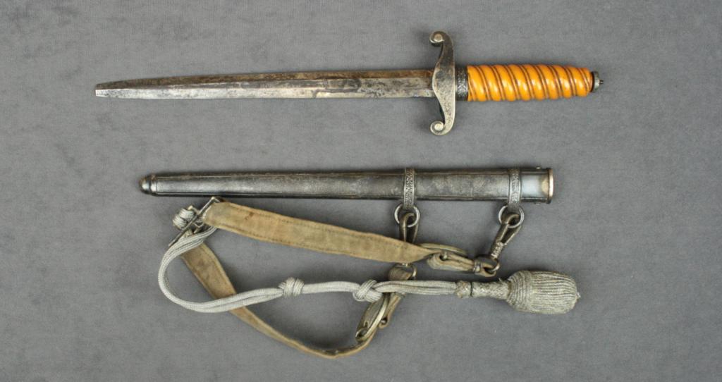 German Officer’s dagger with hanger and  portapie, unmarked blade showing some old  scattered staining to the blade, missing the  pommel cap; somewhat rough condition.  Est.:   $150-$250.