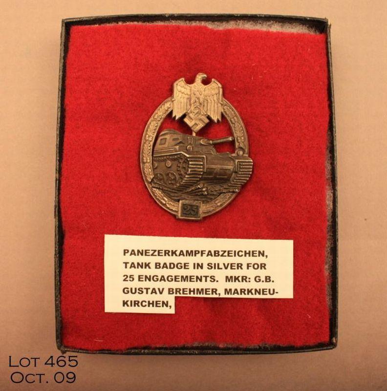 German Panezerkampfabzeichen tank badge in silver for 25 engagements; in overall very good condition and in a small riker case. Maker: G.B. Gustav Brehmer. Guaranteed authentic and verified by Antiques Roadshow guest expert Bruce Herman.Est.: $400-$800.