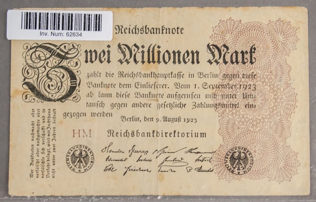 German paper money. Of denomination 2 million marks. Issued 1923. HM watermark.