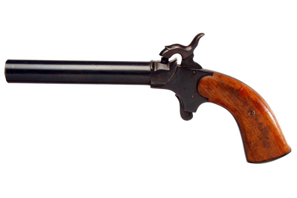 German Percussion Cal .64 SN:NVSN German proofed single shot pistol showing "R" makers mark in circle on the left beech. Blued finish, smooth wood grips, 5 1/2" barrel, working action. Condition: 90% blued remains of original finish. Good overall.