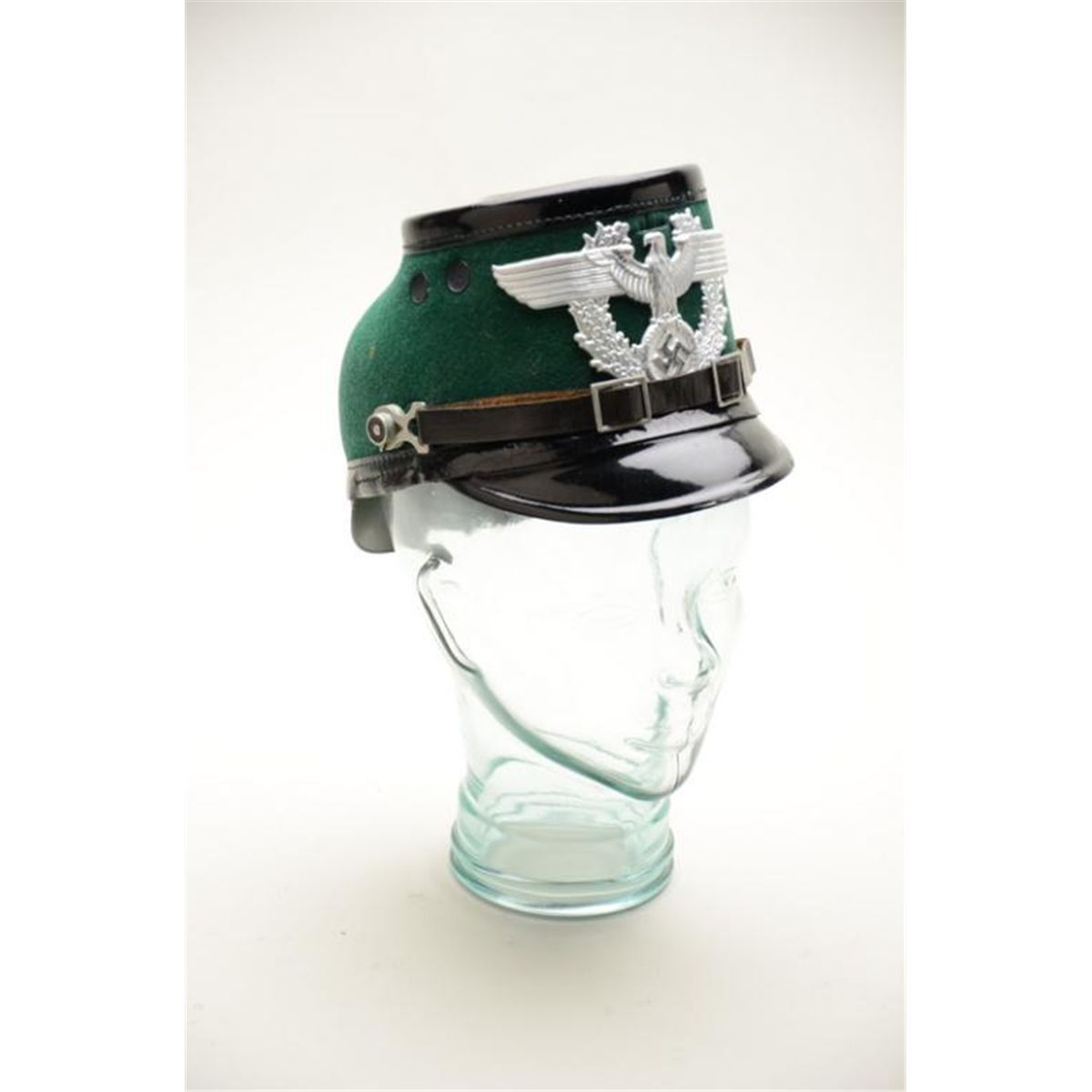 German Police shako helmet in overall very good to fine condition with spread eagle over swastika metal front piece, leather top and brim with strap and leather liner; interior markings “H. Becker & Co.; G.M.B.H.; Berlin,C 2”; one of the nicest examples of this type of shako we have seen in some time. Est.: $250-$500.