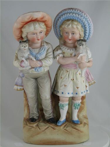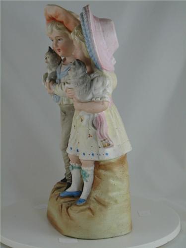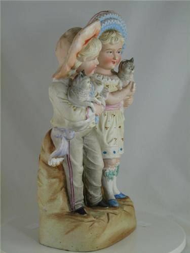 Last quarter 19th Century porcelain bisque figurine, Victorian children holding cats, free standing, hand-painted unglazed pastel tones, standing on plinth, hollow. Unmarked, SC private collector's estate. Condition: chip on one cats ear. Dimensions: 11"