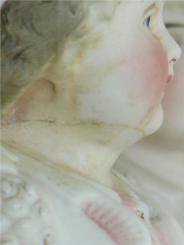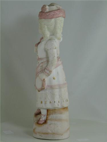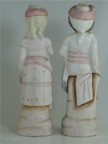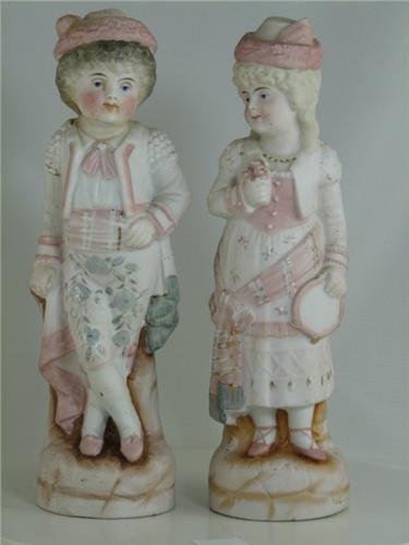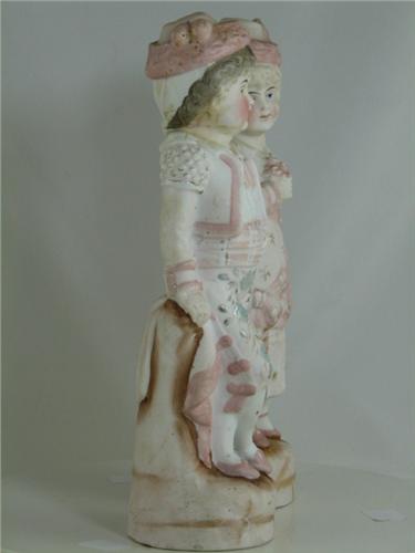 Last quarter 19th Century porcelain bisque figurine, Victorian couple, stand alone, hand-painted unglazed pastel tones, standing on plinth, hollow. Marked" incised "5472 25". SC private collector's estate. Condition: old repair to boys head. Dimensions: 9"H x 2.5"D.