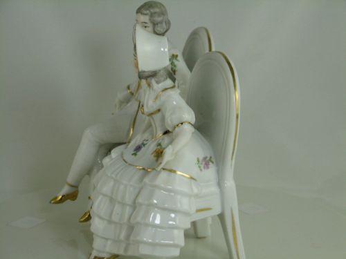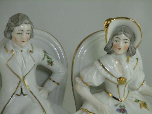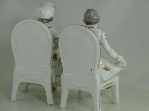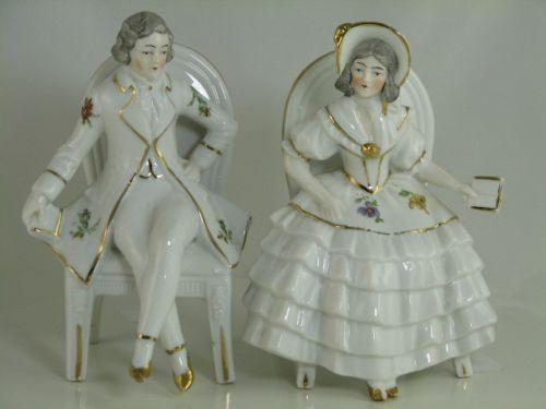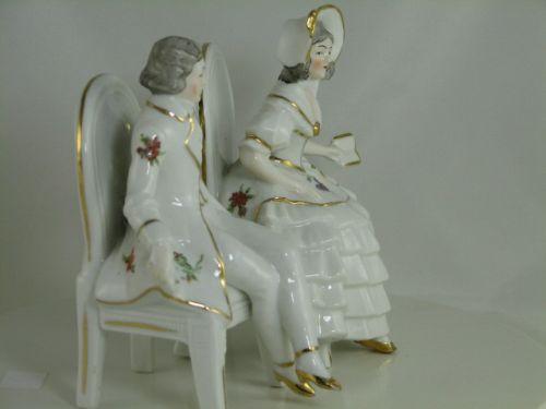 Last quarter 19th Century porcelain figurines, Colonial couple seated, stand alone figurines, hand-painted, hollow. Marked: "Made in Germany". SC private collector's estate. Condition: chip on girl's toe. Dimensions: 5.5"H.