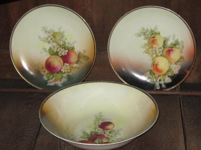 German Porcelain Dishes, 3-Piece Set, marked 'Three Crown China, Germany'. Hand painted with gilt edges.