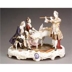 Modeled as a flutist, a pianist and a cellist above a parquet floor base with applied floral sprays. With underglaze blue crowned monogram mark. Lacking one chair back, flute, bow and losses to floral sprays.
