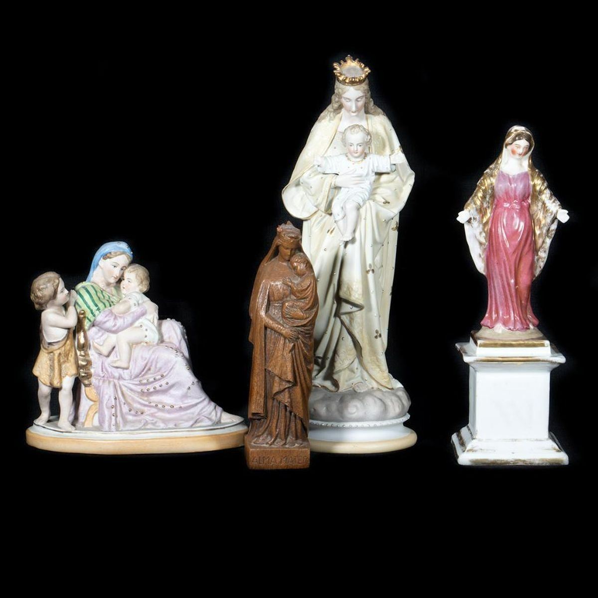 A seated mother holding a child, another standing near; impressed "Germany" and stamped with a red crown and "LR" mark; 7 1/4in. x 7 1/2in; no chips found, line in baby's hair possible hairline, but could be flaw. Together with a porcelain mother and child, blue script "M" mark, 12 1/2in. h., infant missing fingers; a porcelain Mary figure, 11in. h., wear to gilt; and a resin Madonna and child figure.