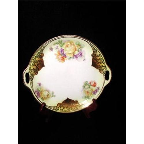 Hand painted double handled German plate C.1910-20 was made by the Three Crown China Company and bears the name,symbol and Germany along with the number 369/494/148 on the back. Yellow roses with purple violets contrast against an off white background. Three bronze color insets with gold smaller floral surround the rose motif. Outlined and edged in gold. Measures 7.75L X 7.25W X 1.25H. Excellent condition,no nicks,chips or cracks.Offers welcome.
