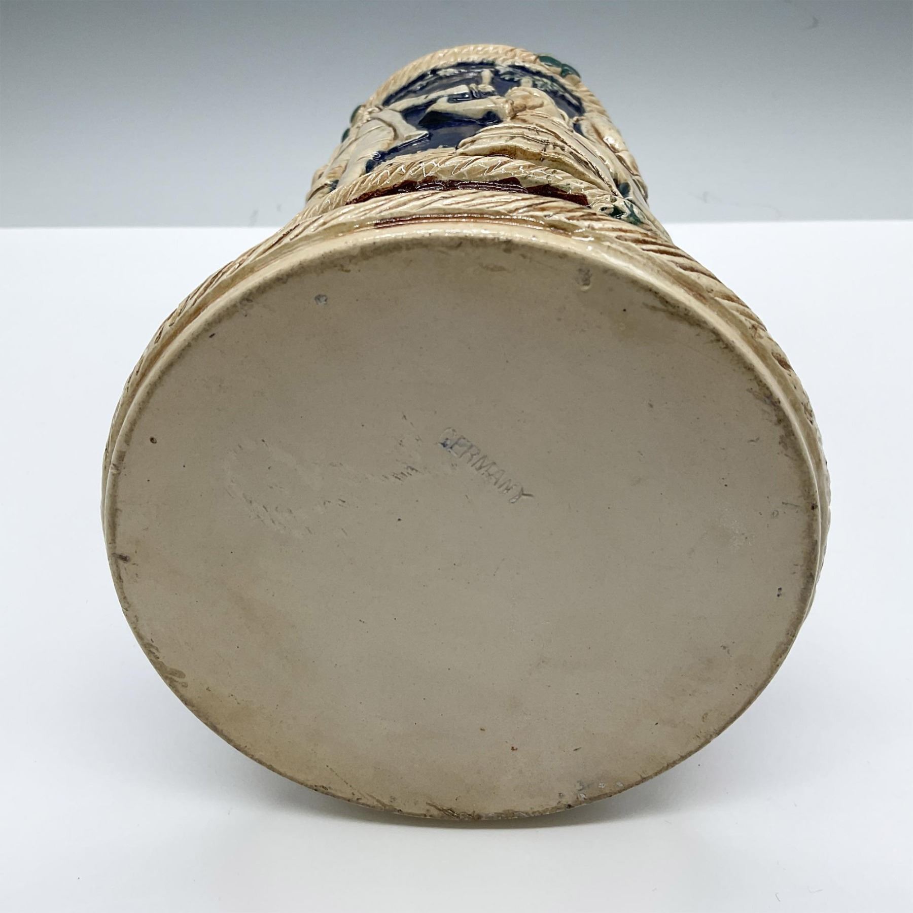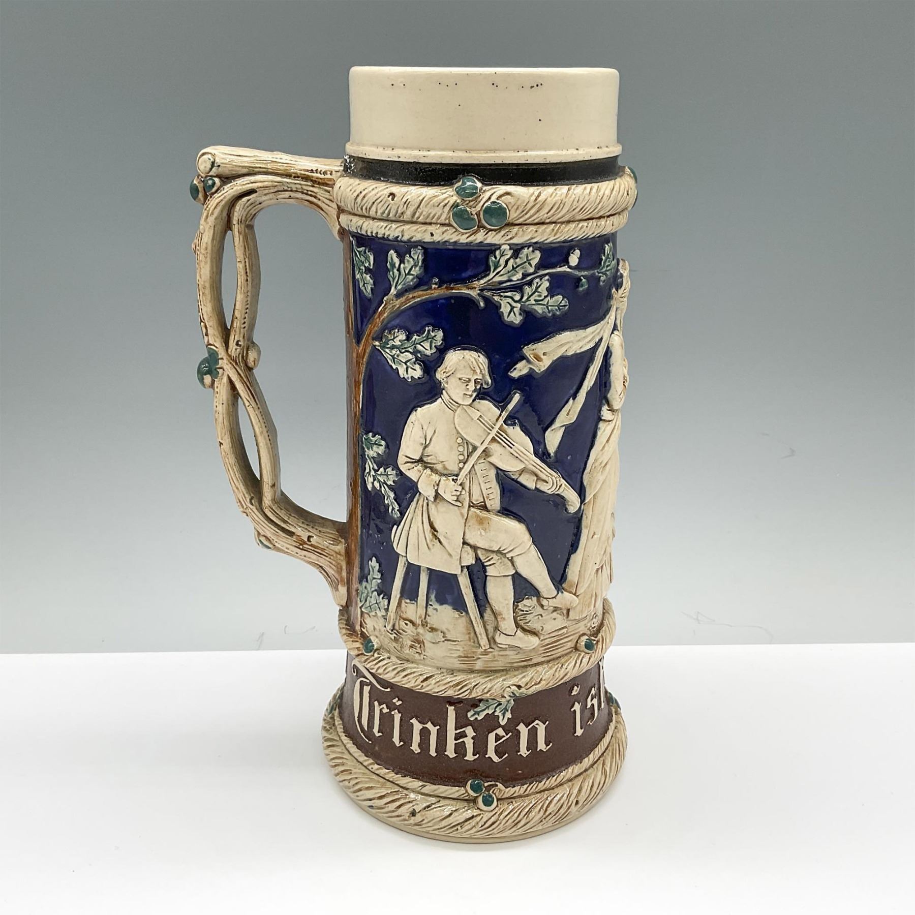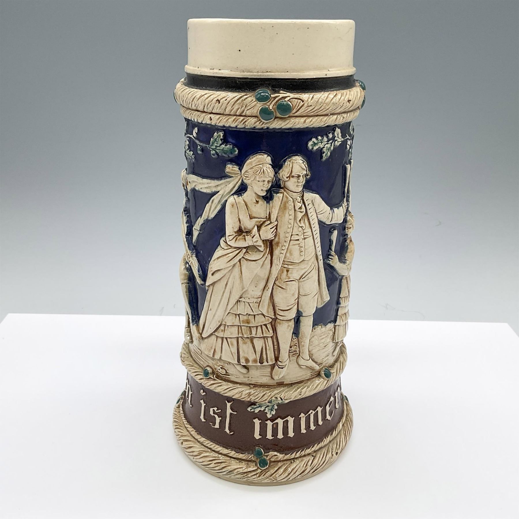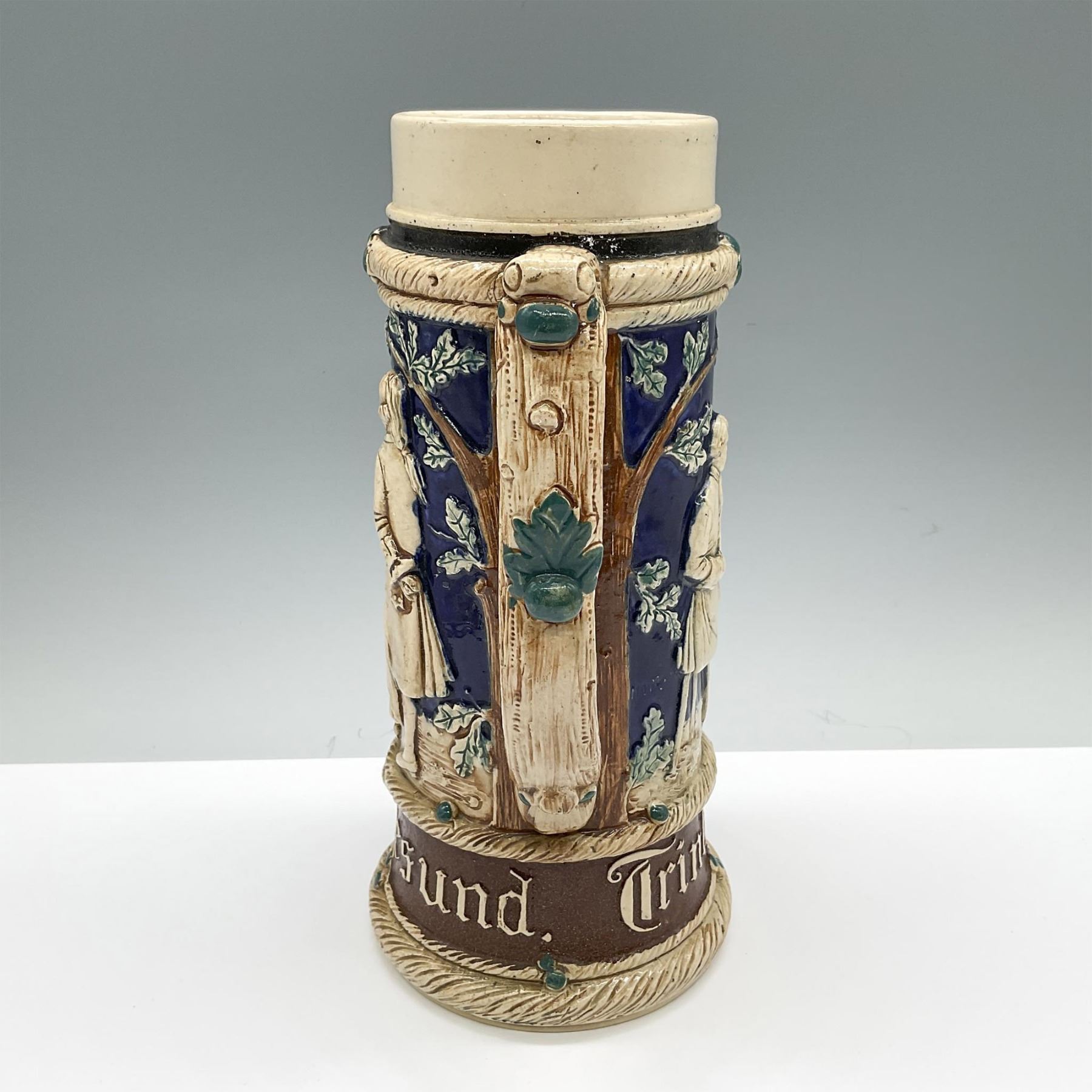 A cream-colored drinking vessel in green, brown, and blue painted glaze. The jug depicts in raised reliefs a cheery wedding scene, where the guests raise their raised drinks to the newlyweds. The inscription along the bottom in German reads: Trinken ist immer gesund. When translated into English it reads: Drinking is always healthy. Germany incised stamp.