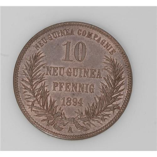 <B>German Protectorate 10 Pfennig 1894A,</B></I> KM3, lightly abraded UNC with considerable mint-red color remaining.<BR><BR><b>Shipping:</b> Coin/Currency (<a target="_blank" href="http://www.heritageauctions.com/common/shipping.php">view shipping information</a>)